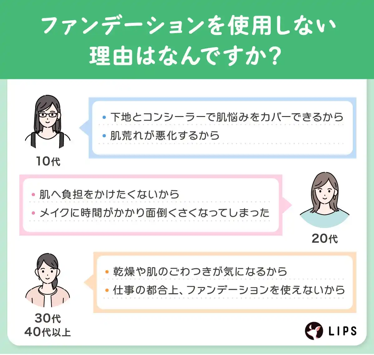 また、最近の下地の高機能化により「下地のみで十分」と感じる層が増えたことも要因の一つでしょう。これは、完璧な作り込みよりも、健やかで自然な素肌感を重視する価値観にシフトしたことがうかがえます。 |