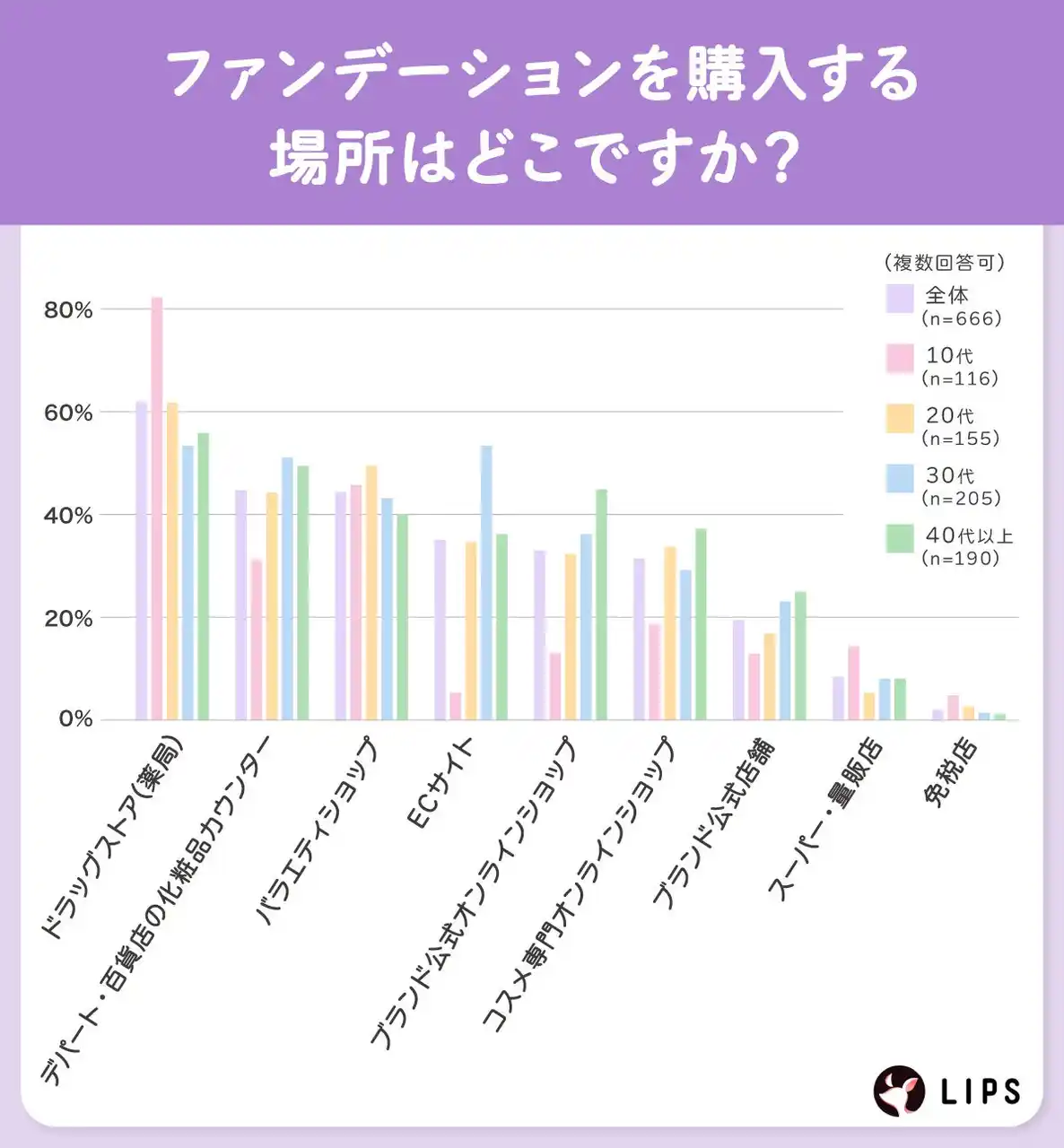 10代では「ドラッグストア(薬局)」での購入が81.0%と突出し、40代以上の55.3%との差が約26ptに達しました 。背景には、若年層にとって、低価格帯のファンデーションが充実しているという利便性の高さがあると考えられます 。 |