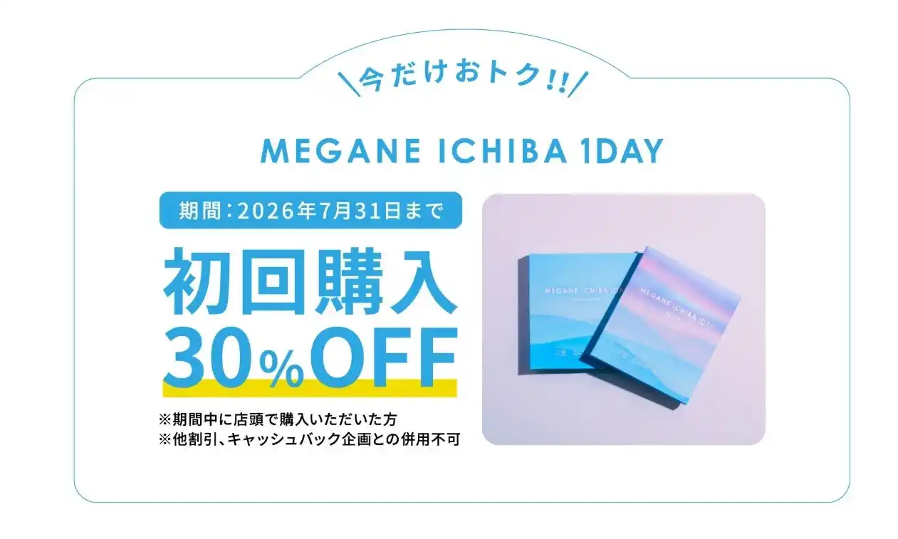 2026年7月31日までの期間中、初めて「MEGANEICHIBA 1DAY」、および「MEGANEICHIBA 1DAY MAX」を購入された方限定で、通常価格より30%OFFする特別キャンペーンを実施します。詳しくは店頭にてお問い合わせください。 |