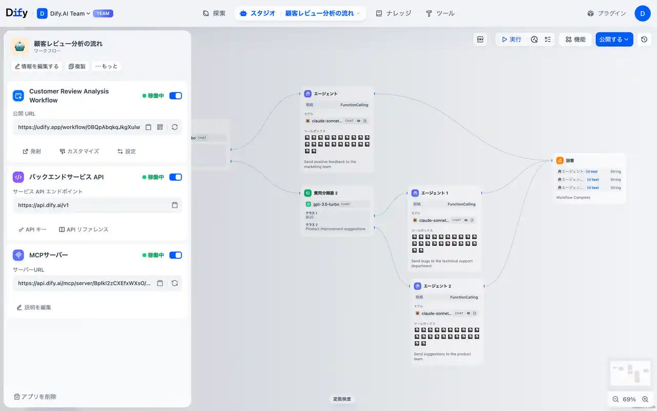 Dify v1.6.0では、作成したエージェントやワークフローを標準MCPサービスとして公開することも可能になりました。これにより、Dify内で構築されたAI機能を、Claude、Cursor等の他のAIツールからも呼び出し可能な企業共通資産として活用できます。一度構築されたAIソリューションが、部門間・アプリケーション間を横断して、組織全体のAIエコシステムで活用される環境が実現されます。 |