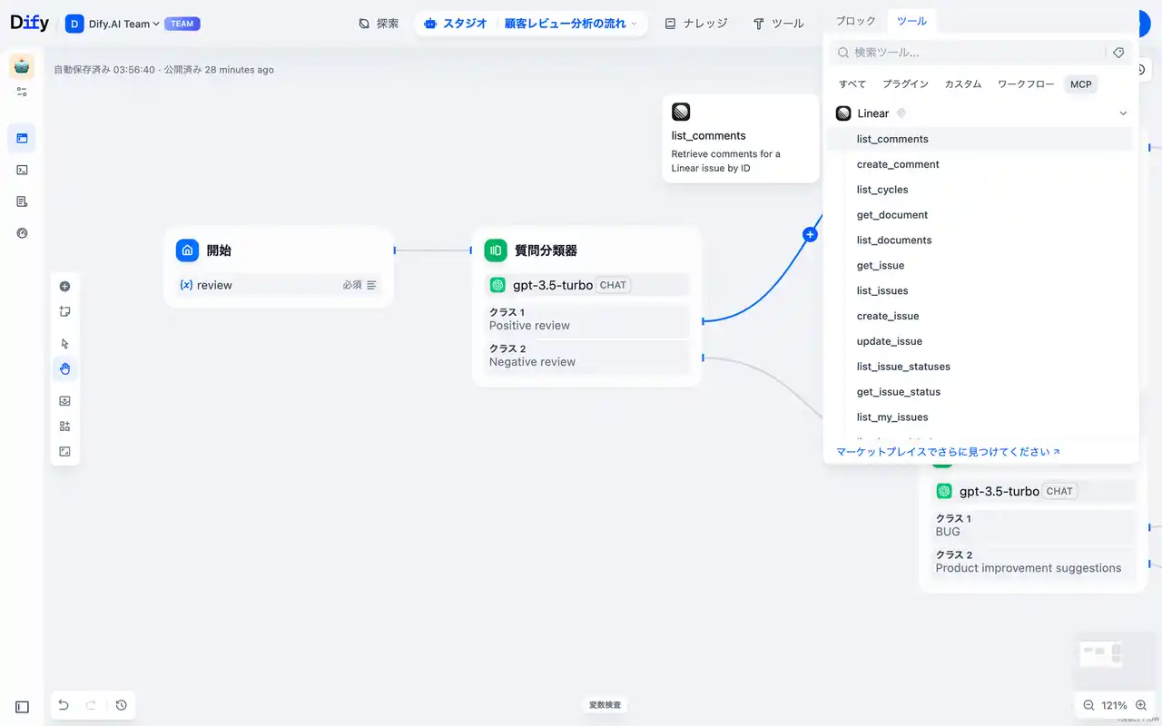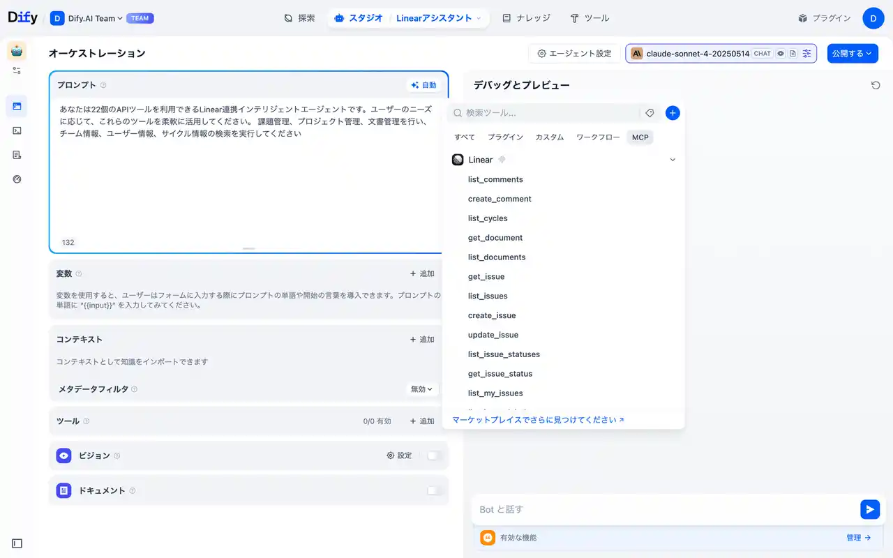 接続されたMCPサービスをDifyエージェントに付与することで、ユーザーの自然言語による要求に応じて、AIが最適なツールを自動選択・実行します。プロジェクト管理、顧客対応、データ処理等の複合的なタスクが、人手を介さずに完結できます。 |