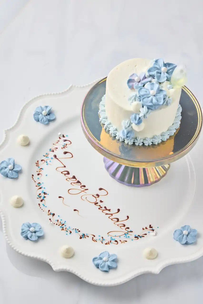 ■ケーキとともに楽しめるアニバーサリープレート 提供時のお皿にメッセージを添えるサービスは、誕生日や記念日、サプライズ利用として多くのお客様にご好評いただいています。5月はブルーの花をあしらったデコレーションに、きらめくブルーシュガーやオーロラパウダーを施した涼しげなプレート。アールグレイショートケーキと並べることで、思わず見惚れるような美しい景色を演出します。 |