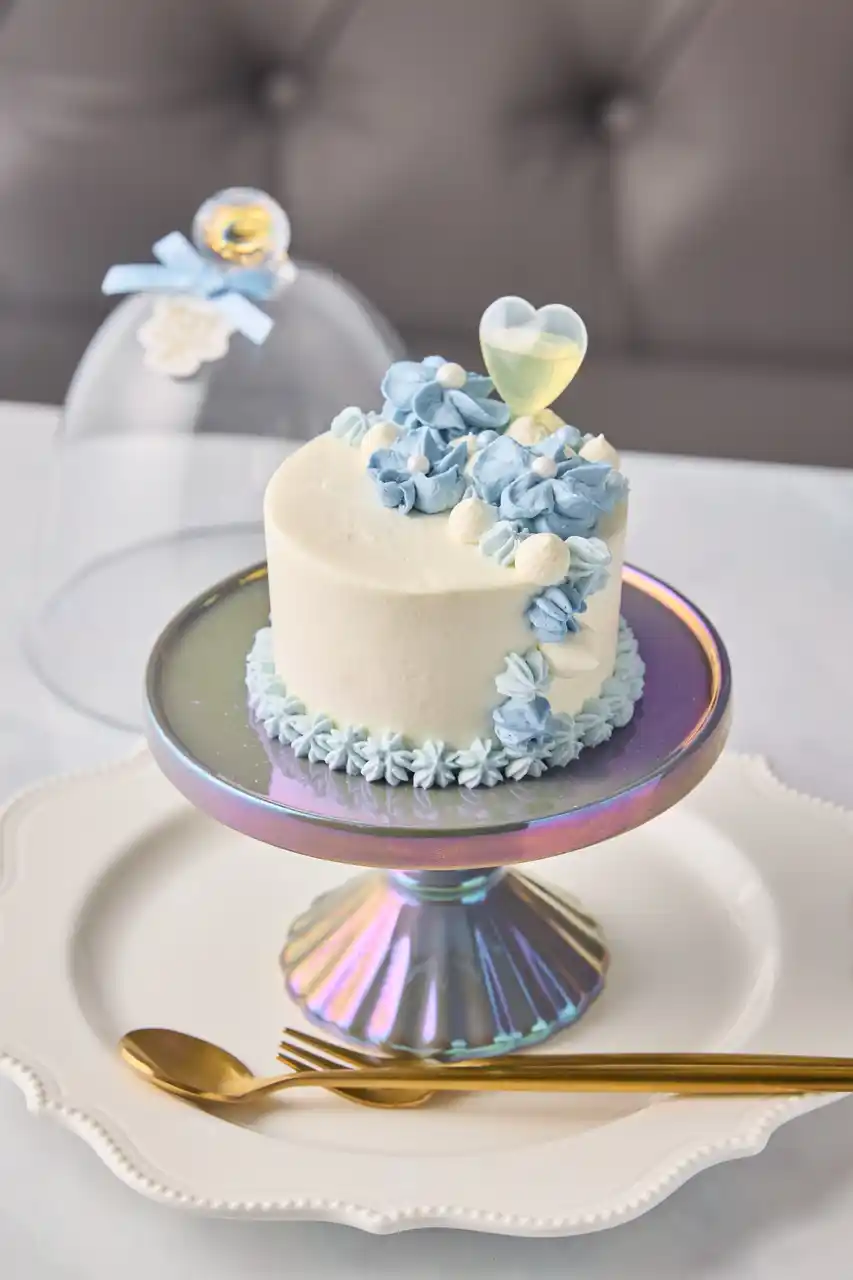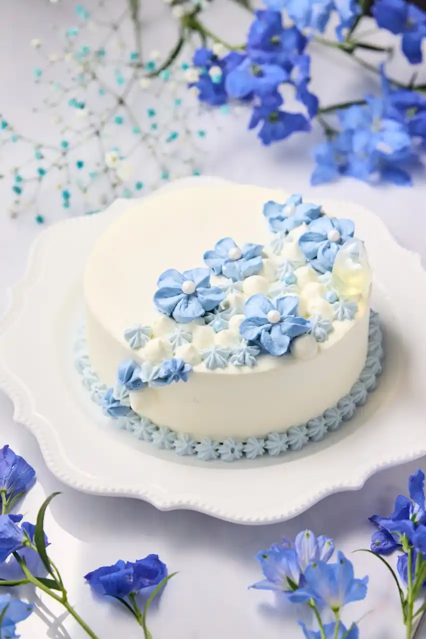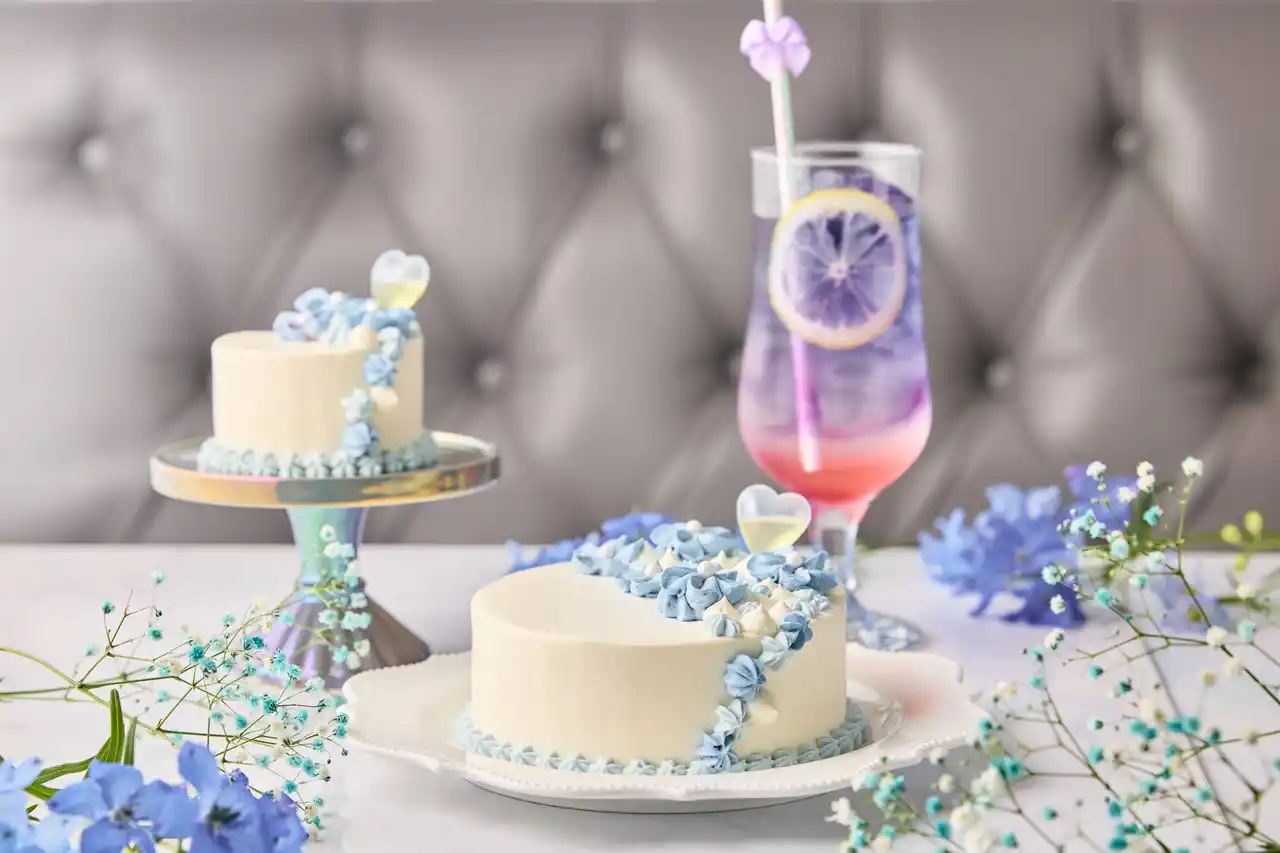 | ネモフィラや紫陽花を思わせるライトブルーのケーキ、初夏を彩る特別なスイーツ体験を提供。 | |||