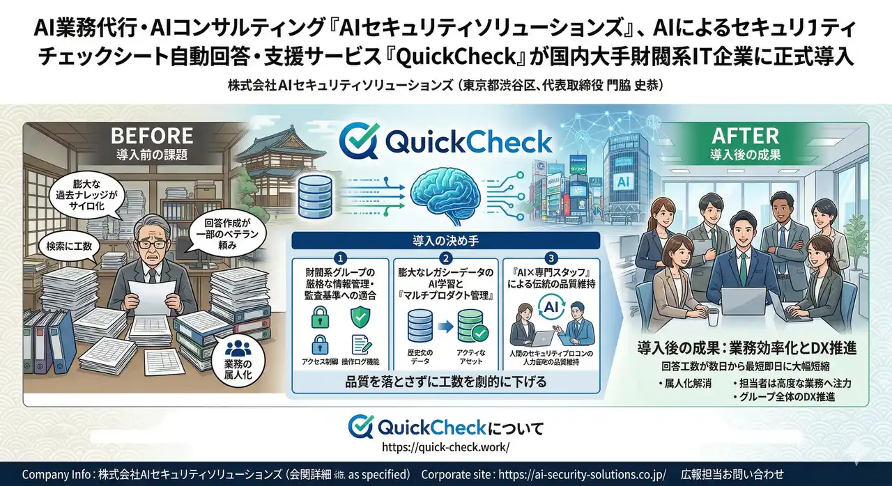 AI業務代行(BPO)やAIコンサルティング事業を展開する株式会社AIセキュリティソリューションズ(本社:東京都渋谷区、代表取締役:門脇 史恭)は、AIによるセキュリティチェックシート自動回答・支援サービス「QuickCheck(クイックチェック)」が、国内有数の財閥系グループに属する老舗の大手IT企業(※情報セキュリティおよび機密保持の観点から企業名は非公開)に正式導入され、運用開始および初回納品が完了したことをお知らせいたします。 |