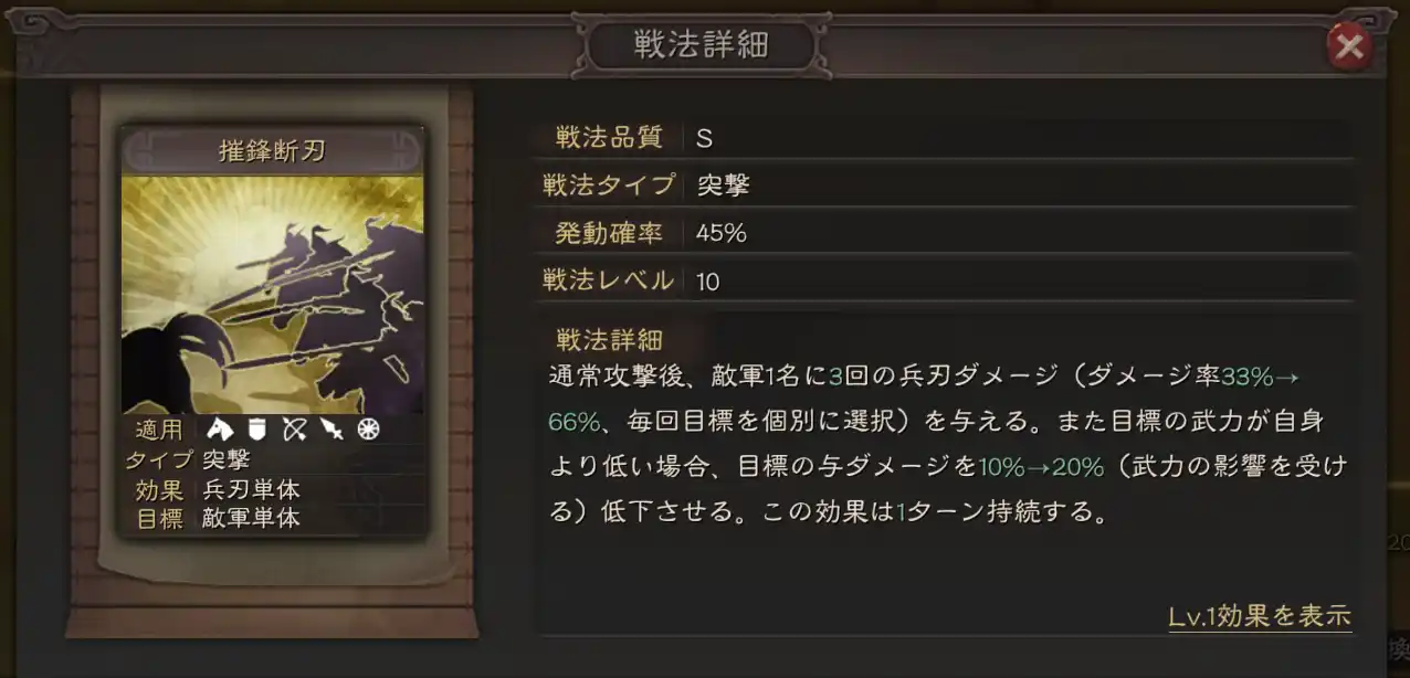 通常攻撃後、敵軍1名に3回の兵刃ダメージ(ダメージ率33%→66%、毎回目標を個別に選択)を与える。また目標の武力が自身より低い場合、目標の与ダメージを10%→20%(武力の影響を受ける)低下させる。この効果は1ターン持続する。 |