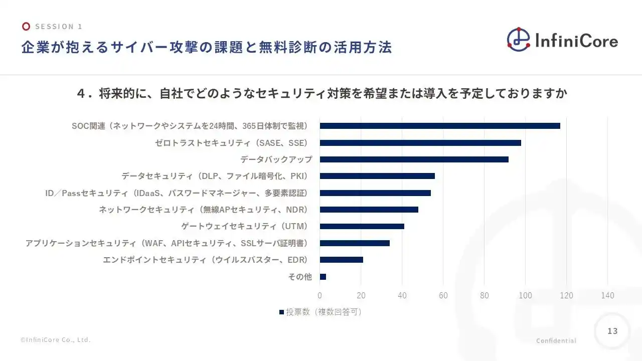 【資料:P13 将来的に、自社でどのようなセキュリティ対策を希望または導入を予定しておりますか】 |