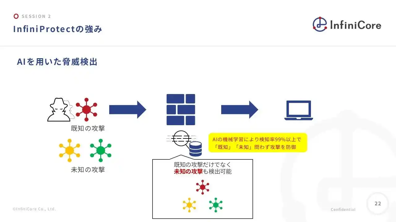 InfiniProtectでは、AIの機械学習により検知率99%以上で「既知」「未知」問わず攻撃を防御することが可能です。このAI技術により、従来の検知手法では対応できなかった新種の攻撃や、わずかに変形させた攻撃も効果的に検出・ブロックすることができます。 |