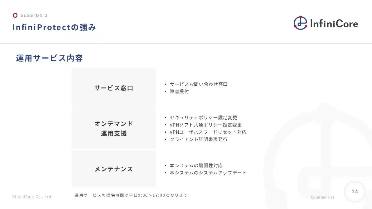 InfiniProtectでは、これらの運用管理を弊社が代行するサービスを提供しています。サービス窓口(サービスお問い合わせ窓口、障害受付)、オンデマンド運用支援(セキュリティポリシー設定変更、VPNソフト共通ポリシー設定変更、VPNユーザパスワードリセット対応、クライアント証明書再発行)、メンテナンス(本システムの脆弱性対応、本システムのシステムアップデート)といった運用サービスが含まれており、お客様自身で運用する必要はありません。 |