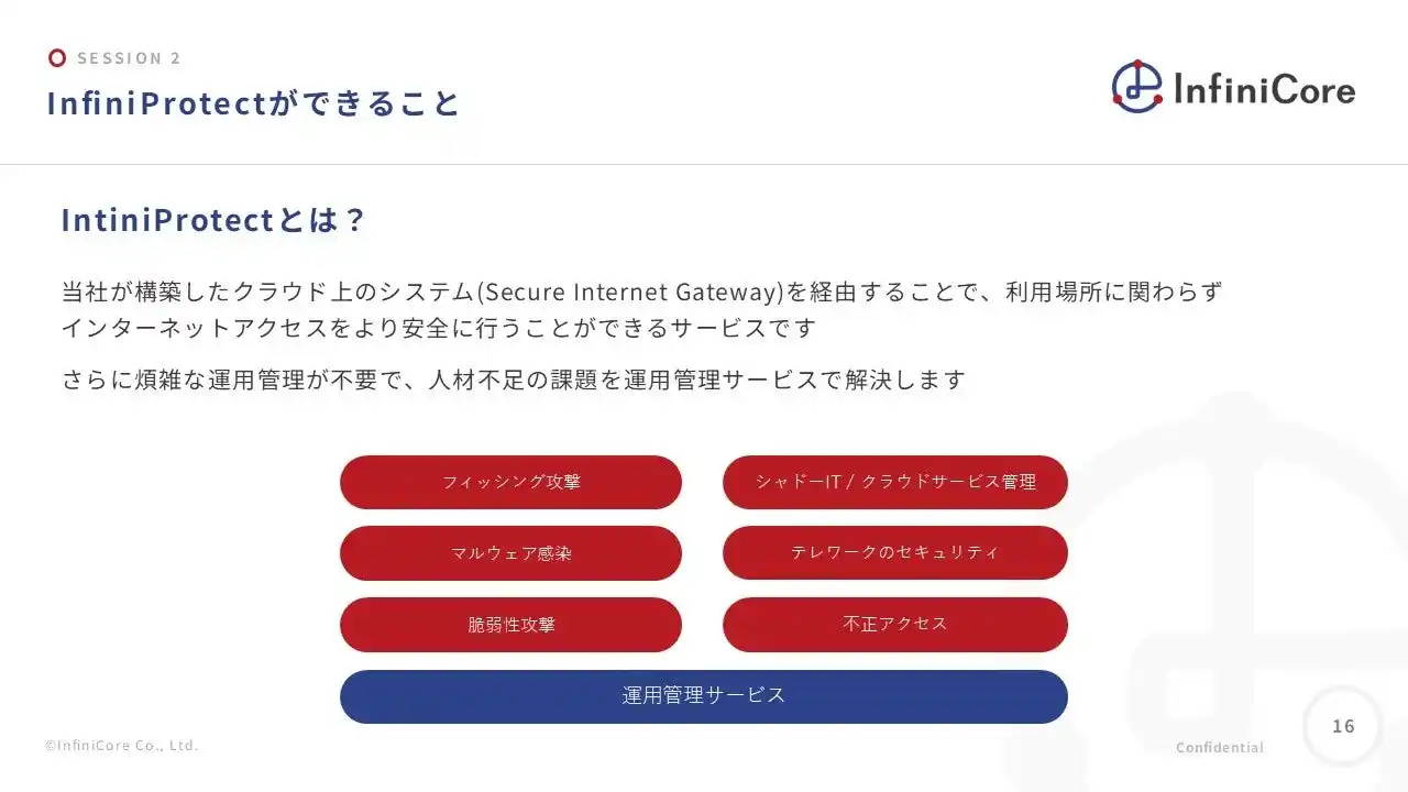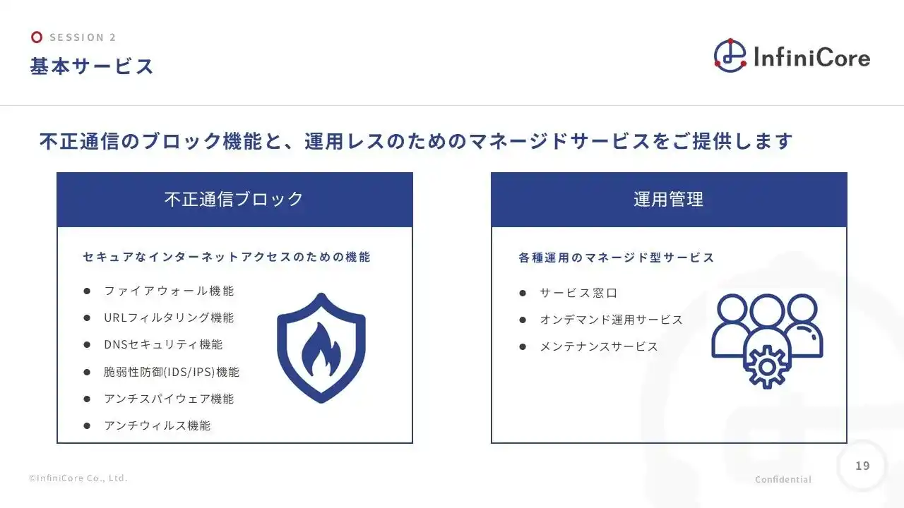 InfiniProtectの基本サービスは、不正通信ブロックと運用管理の2つに大別されます。不正通信ブロックには、ファイアウォール機能、URLフィルタリング機能、DNSセキュリティ機能、脆弱性防御(IDS/IPS)機能、アンチスパイウェア機能、アンチウィルス機能が含まれています。運用管理には、サービス窓口、オンデマンド運用サービス、メンテナンスサービスが含まれており、セキュリティの専門知識がなくても安心して利用できる環境を提供しています。 |