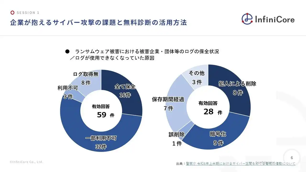 【資料:P6 ランサムウェア被害における被害企業・団体等のログの保全状況/ログが使用できなくなっていた原因】 |