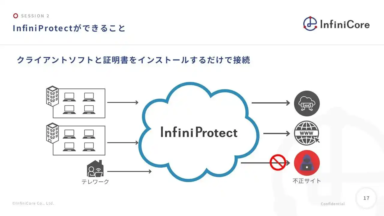InfiniProtectのようなクラウド型ゼロトラストセキュリティの導入は、中小企業にとって特に適しています。多くの中小企業ではセキュリティの専門知識を持った従業員が少なく、セキュリティ製品の運用を専門家に任せてコアビジネスに集中したいというニーズがあります。また、ファイアウォール(UTM)製品を導入しても脆弱性に伴うパッチ適用ができていなかったり、テレワークを許可しているもののインターネット利用は個人のネット環境に依存してしまっていたりする状況も見られます。さらに、AIを用いたサイバー攻撃など最新の脅威から情報資産を守る必要性も高まっています。 |