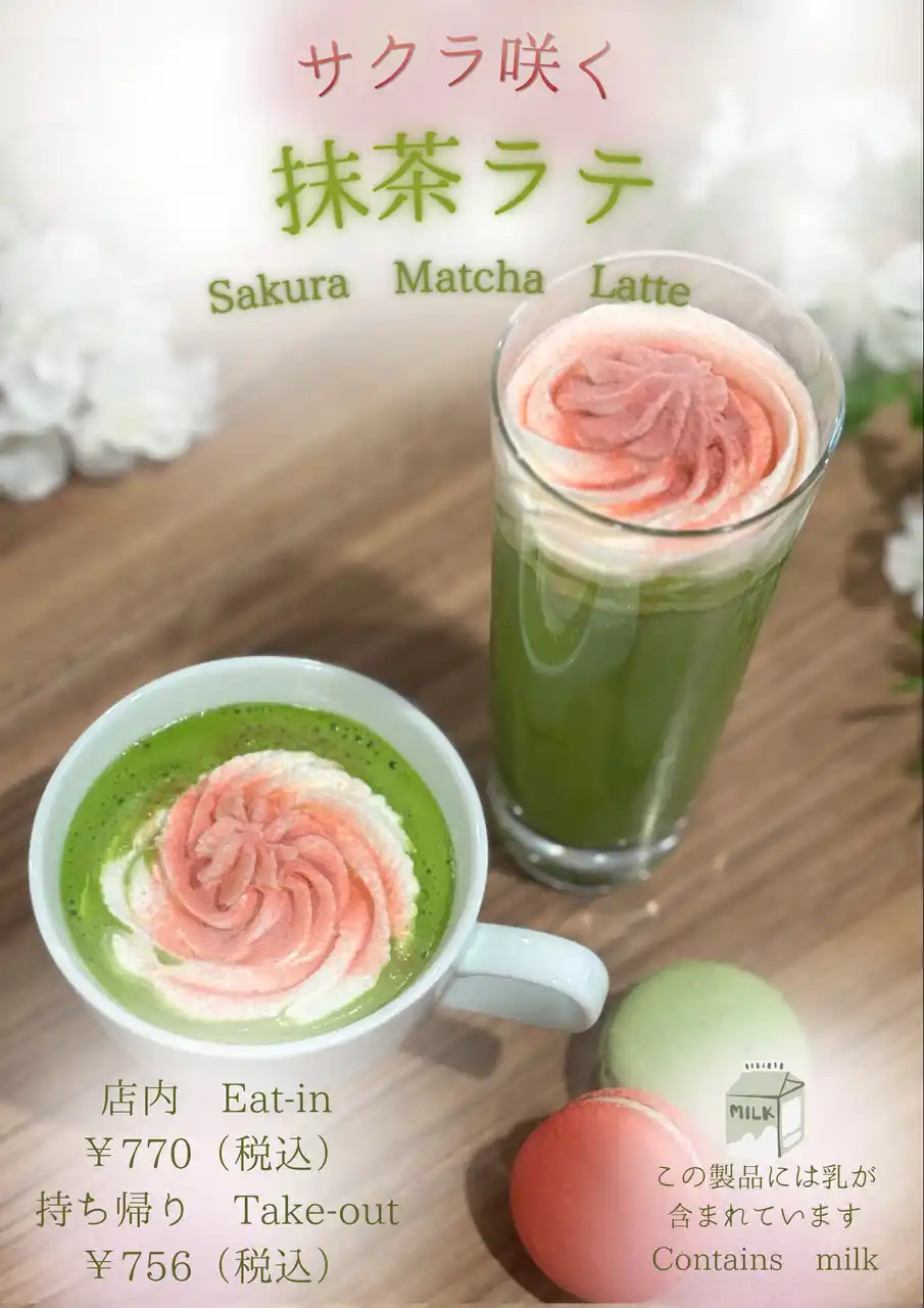 | 見た目も桜色が美しく、思わず写真に残したくなる可愛らしさ。ほっと一息つきたい時間にぴったりの、季節限定の特別な抹茶ラテです。 | |||