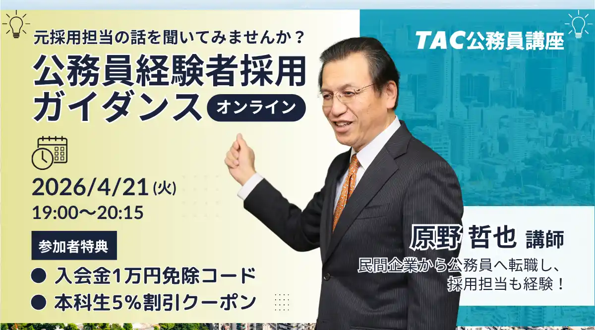 TAC公務員(経験者採用)講座では、2026年4月21日(火)19:00~、元公務員で採用担当も経験のある原野講師によるオンラインガイダンスを開催します。 オンラインガイダンスでは、実際に民間から公務員へ転職した講師が経験者採用区分の試験制度のほかに、民間(または公務員)から公務員へ転職するメリット、公務員の仕事内容や向いている人の特徴など、お話します。 |
