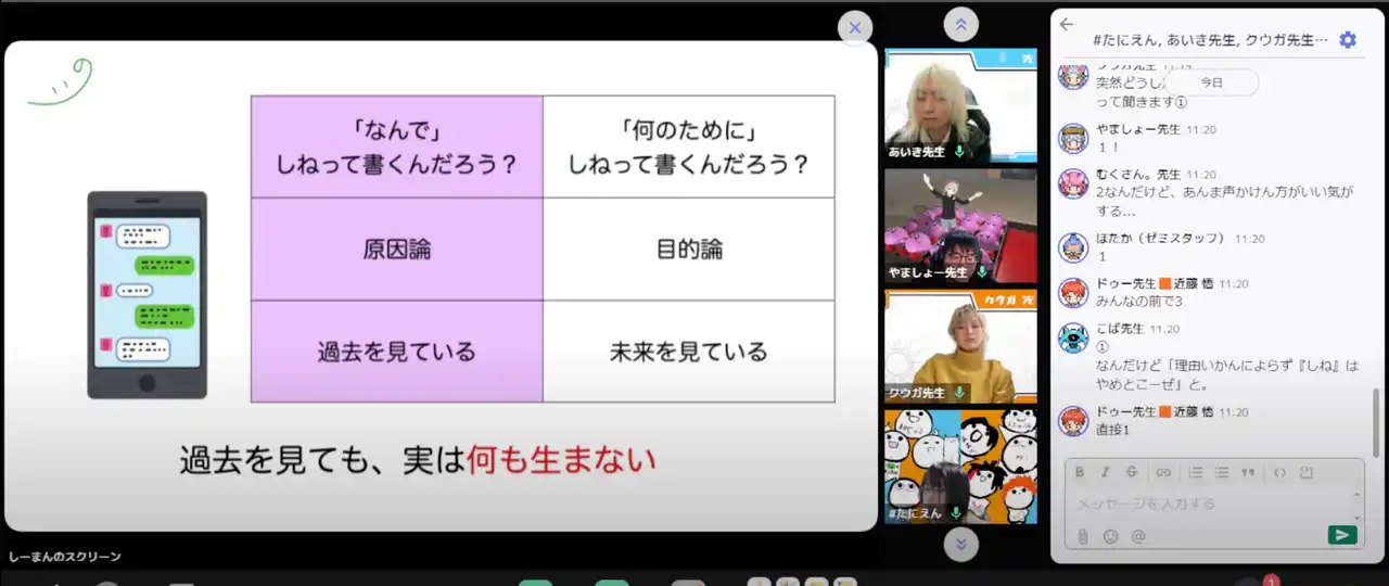 スタッフ研修で実証済みのメソッド 今年 2 月、島川先生を招いた ITeens Lab スタッフ研修では「目的論」に基づく声かけ術を導入。 子どもの自己肯定感が高まったと好評でした。今回はそのエッセンスを家庭向けに公開します。 |