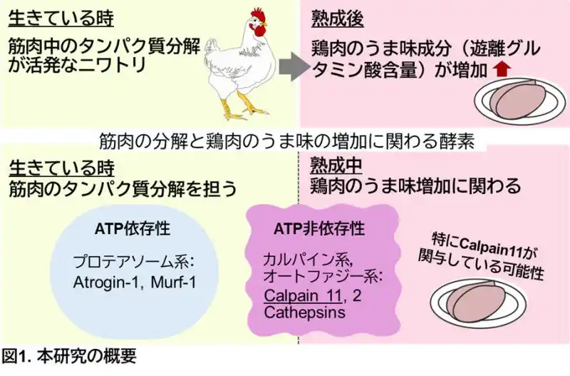 | 本研究では、筋肉中のタンパク質の分解が進み、熟成後のむね肉の遊離グルタミン酸含量が増加したニワトリにおいて、むね肉中のタンパク質分解酵素(Calpain 11)の遺伝子発現量が上昇することを明らかにしました。また、熟成後のむね肉中の遊離グルタミン酸含量は、電気泳動で検出された約12-15 kDaの未知の筋原線維タンパク質のバンド強度とも関連していました。 | |||||||||