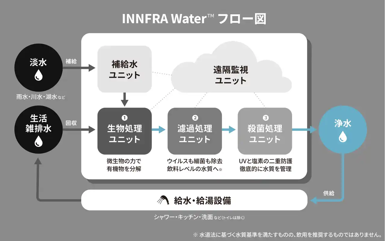 | INNFRA株式会社(本社:山梨県甲府市、代表取締役:川島壮史、以下「INNFRA」)は、INNFRAの水循環システム「INNFRA Water」を採用した、株式会社MUJI HOUSEの「インフラゼロハウス」が、日本財団 渚の交番 戸田 彩湖BASE(埼玉県戸田市)において全国で初めて実装されたことをお知らせします。 | |||