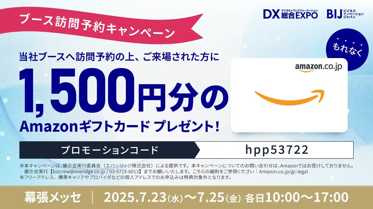 プロモーションコードをご入力の上、事前にご予約&ブース訪問された方には、Amazonギフトカード1,500円分を進呈いたします(※展示会実行委員会より提供)。 |