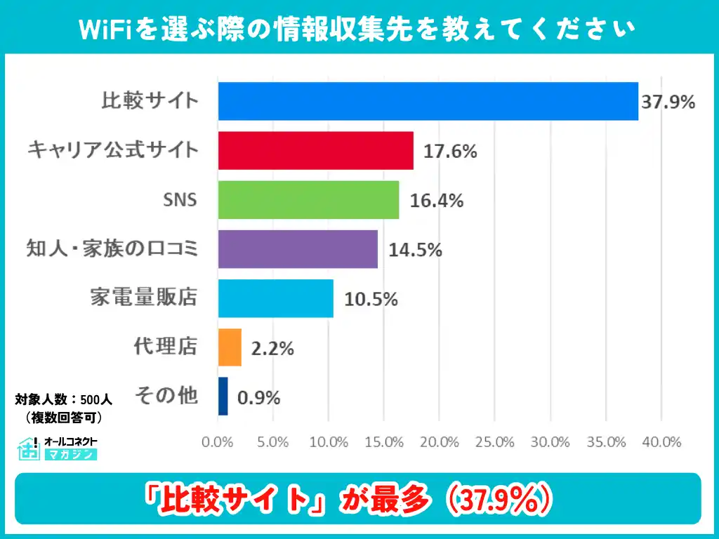 WiFi選びの情報源は「比較サイト」が37.9%で最多 SNS+口コミで30.9%と、リアルな体験談の影響力も大きい 対面チャネルは約13%にとどまり、オンラインでの情報収集が主流