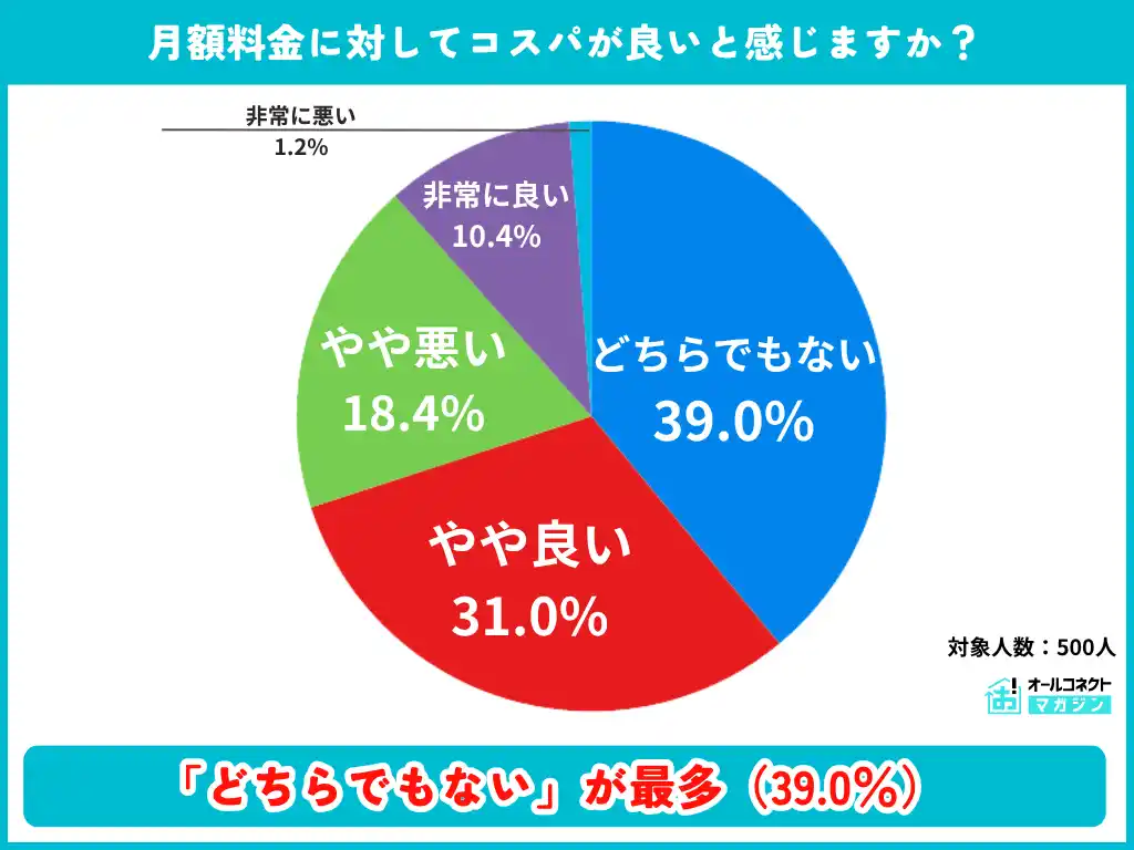 月額料金に対するコストパフォーマンスを聞いたところ、「どちらでもない」が39.0%で最多でした。「やや悪い」18.4%と「非常に悪い」1.2%で、合計19.6%がコスパに不満を感じています。 |
