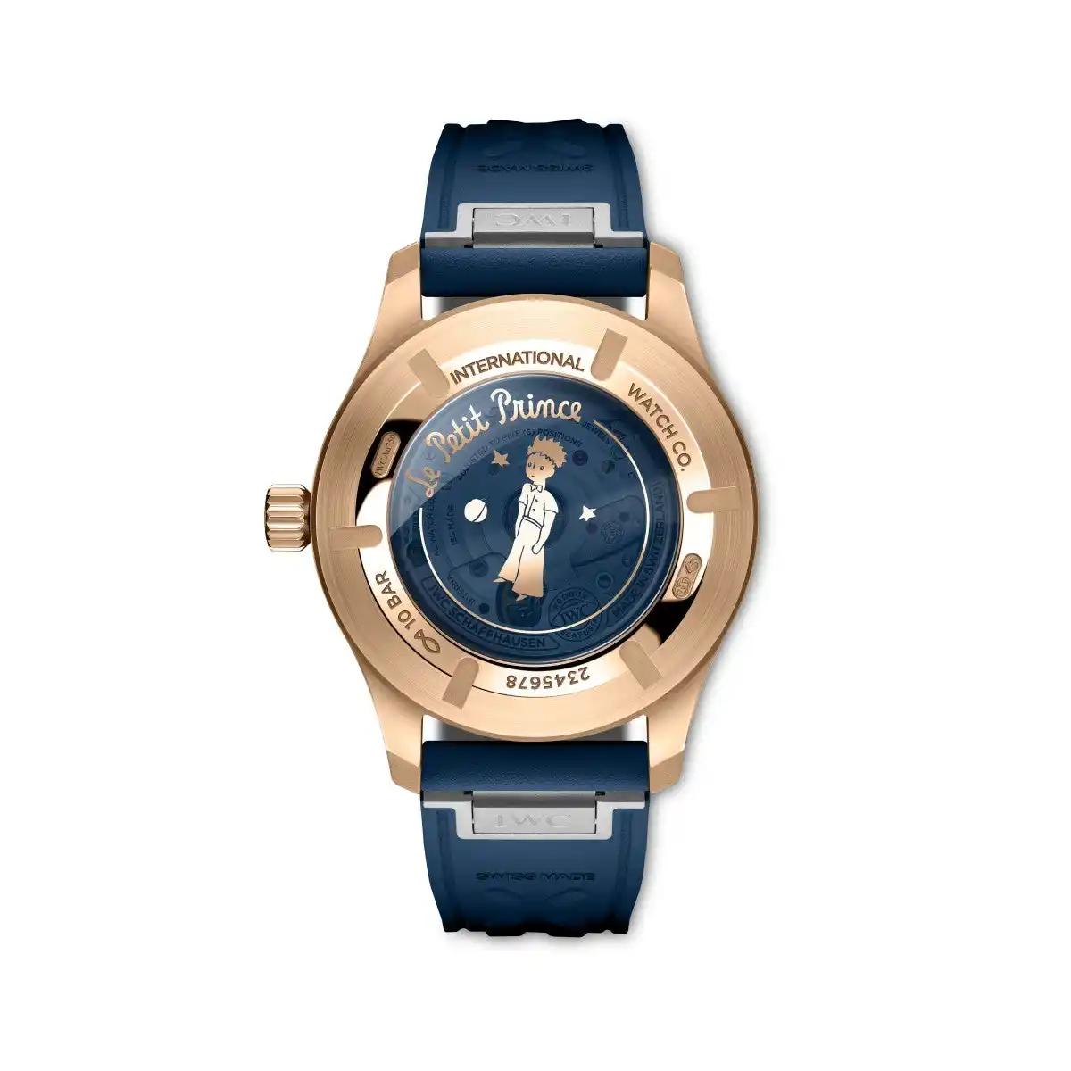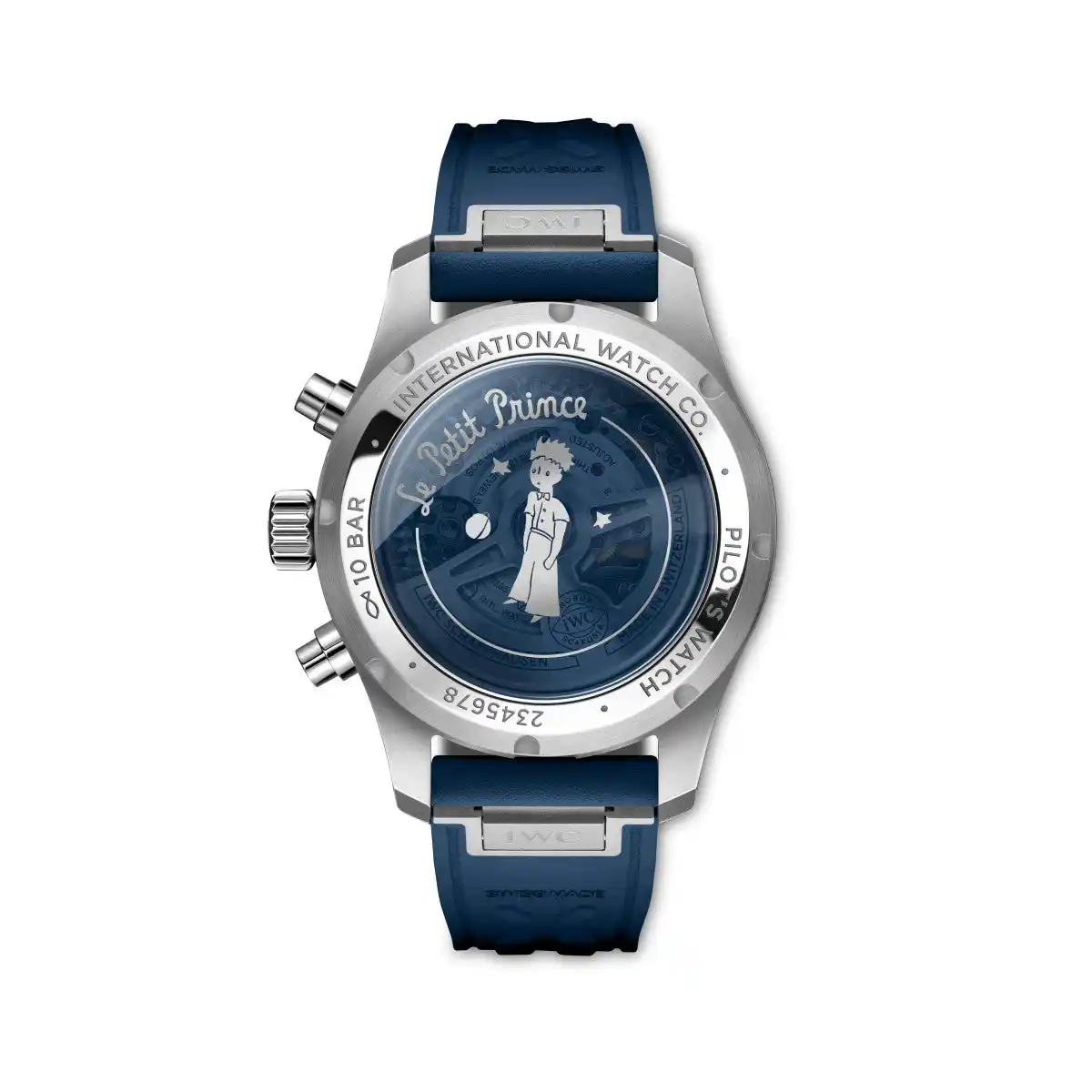 mm。いずれもサン=テグジュペリの代表的な小説に 捧げられたIWCの特別限定モデルの特徴であるサンレイ 仕上げを施したディープブルーの文字盤を備えています。文字盤にはインデックスと数字がホワイトでプリントされ ています。特徴的なデザインの要素として、このクロノグラ フはスーパールミノバ(R)をコーティングしたゴールドメッキ の針を採用。着色サファイアガラスの裏蓋には、特徴的な 「Le Petit Prince」の文字、月、そして2つの星に囲まれた 「星の王子さま」が描かれています。 |