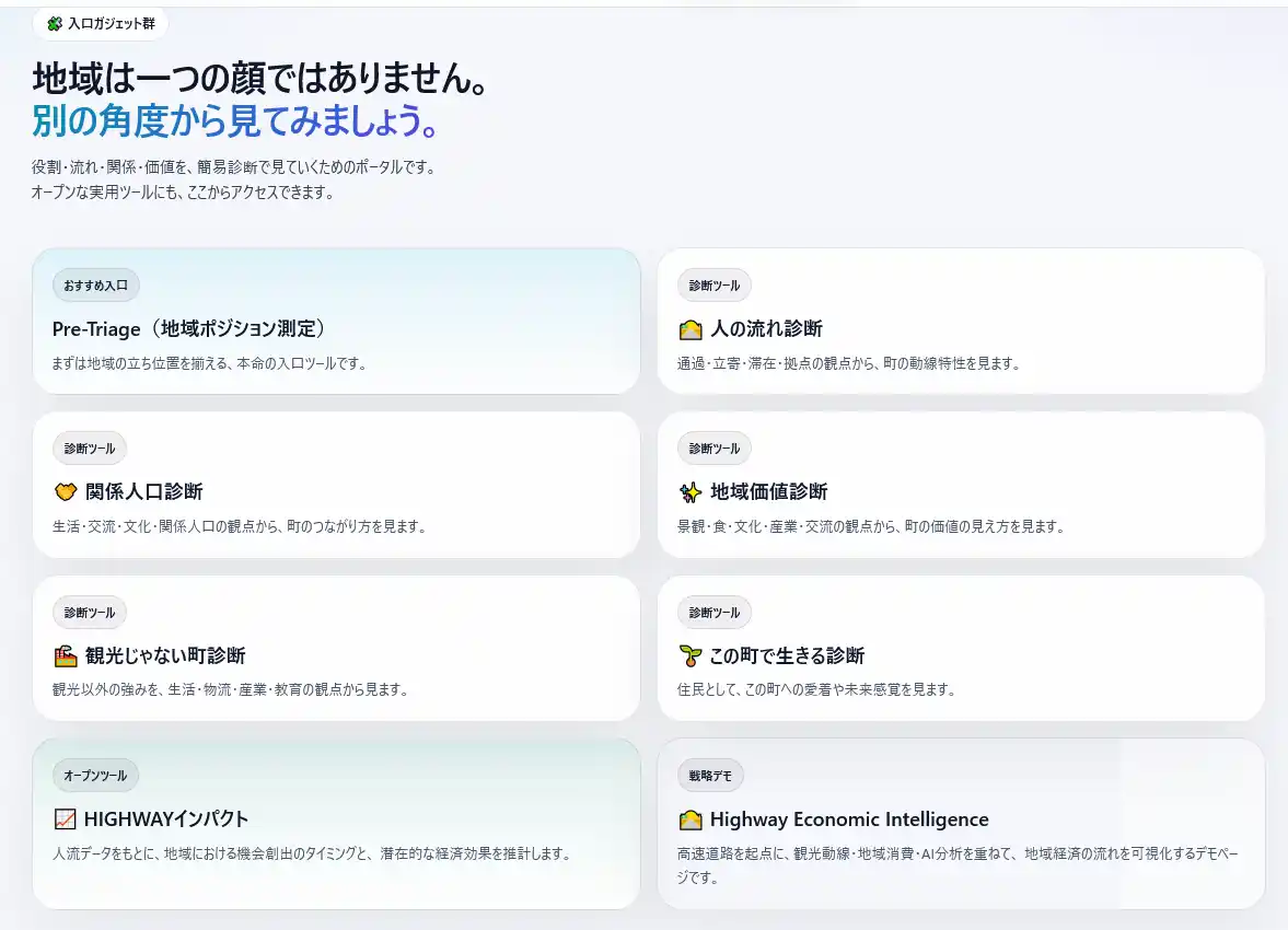 ・ 実装フィールド(地域モデルの可視化) ・ 地域診断ガジェット群 ・ ポータル・防災・メディアの統合UI ・ AIエージェント関連の導線(申請制) ・ API連携を前提とした機能構成(内部接続基盤として設計) |