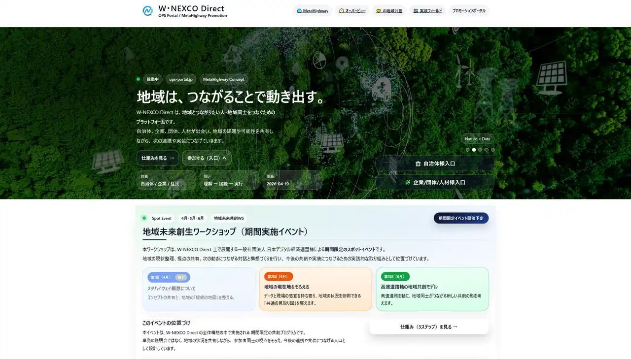 | 現在、宮崎県内自治体をはじめとする複数地域において実証・導入が進行しており、NEXCO西日本との共創による「W・NEXCO Direct / MetaHighway」などの取り組みを通じて、地域単位での実装モデルの展開が、複数地域で進行しています。 | |||||