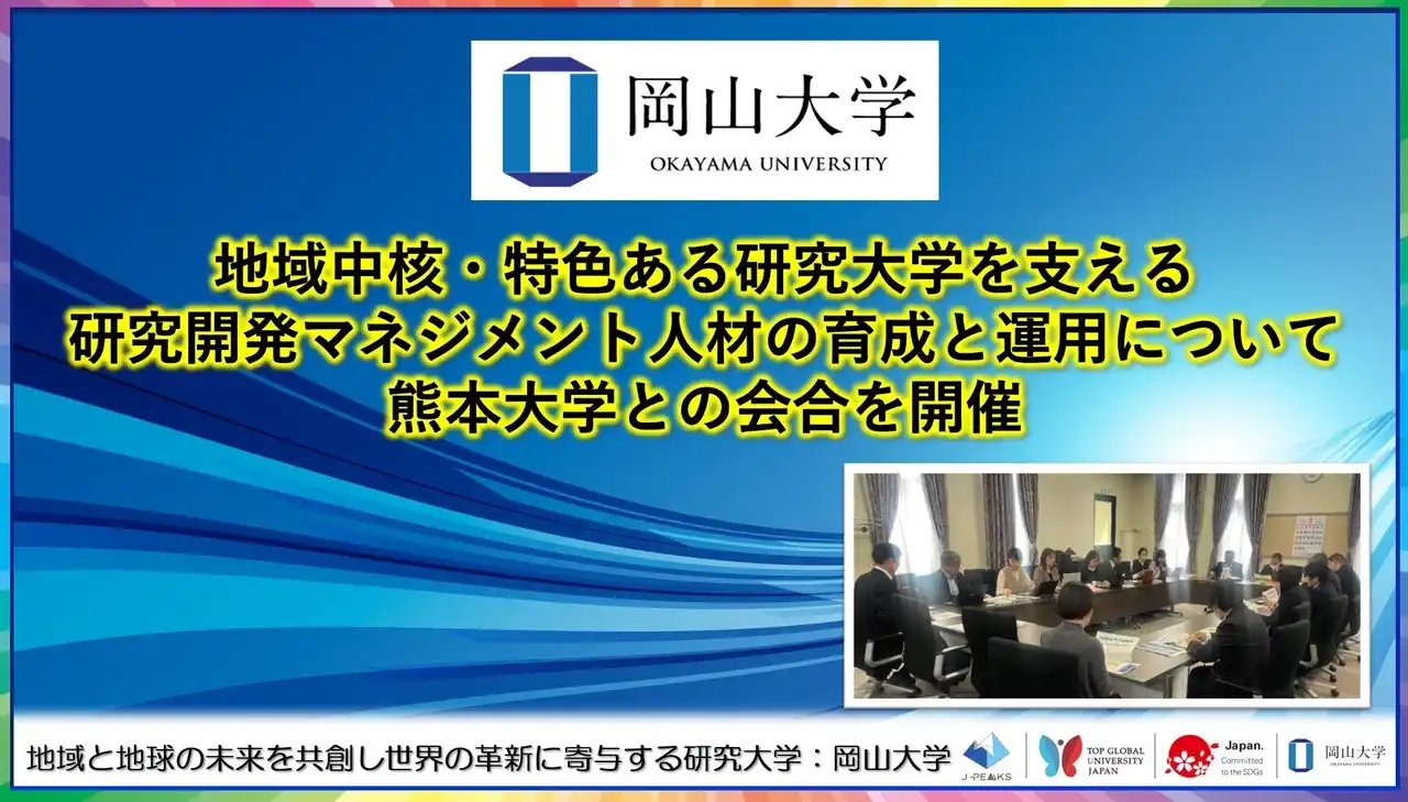 | 国立大学法人岡山大学(本部:岡山市北区、学長:那須保友)は2026年3月24日、大阪大学とともに熊本大学黒髪南キャンパス(熊本市)を訪問し、研究開発マネジメント人材の育成と運用などに関する会合を開催しました。 | ||||