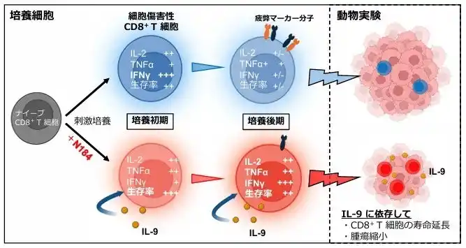 | CD8 T細胞の刺激培養時にN184を共存させるとインターロイキン9(IL-9)産生細胞へと分化し、寿命が延長すると同時に、免疫疲弊分子の発現を抑制してインターフェロンγ(IFNγ)、インターロイキン2(IL-2)、腫瘍壊死因子(TNFα)の産生を増強し、且つ、抗アポトーシス分子を誘導してCD8 T細胞の細胞死を防ぐことを明らかにしました。 | |||||||||