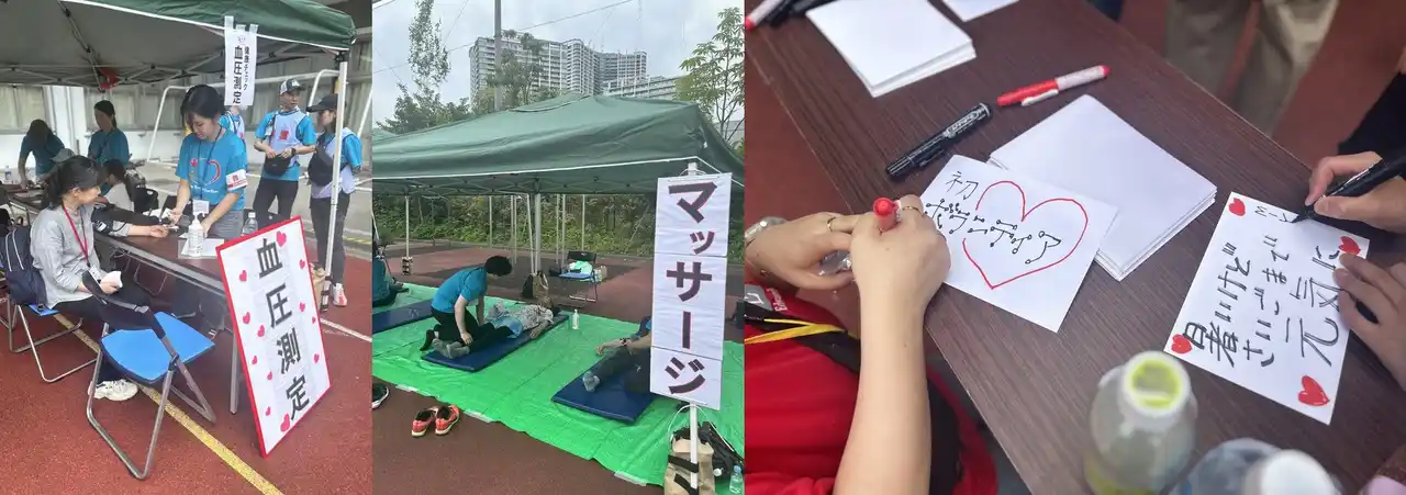 ▲会場内には血圧測定コーナーや理学療法士によるマッサージコーナー等がある。ボランティアから参加者へのメッセージも。 |