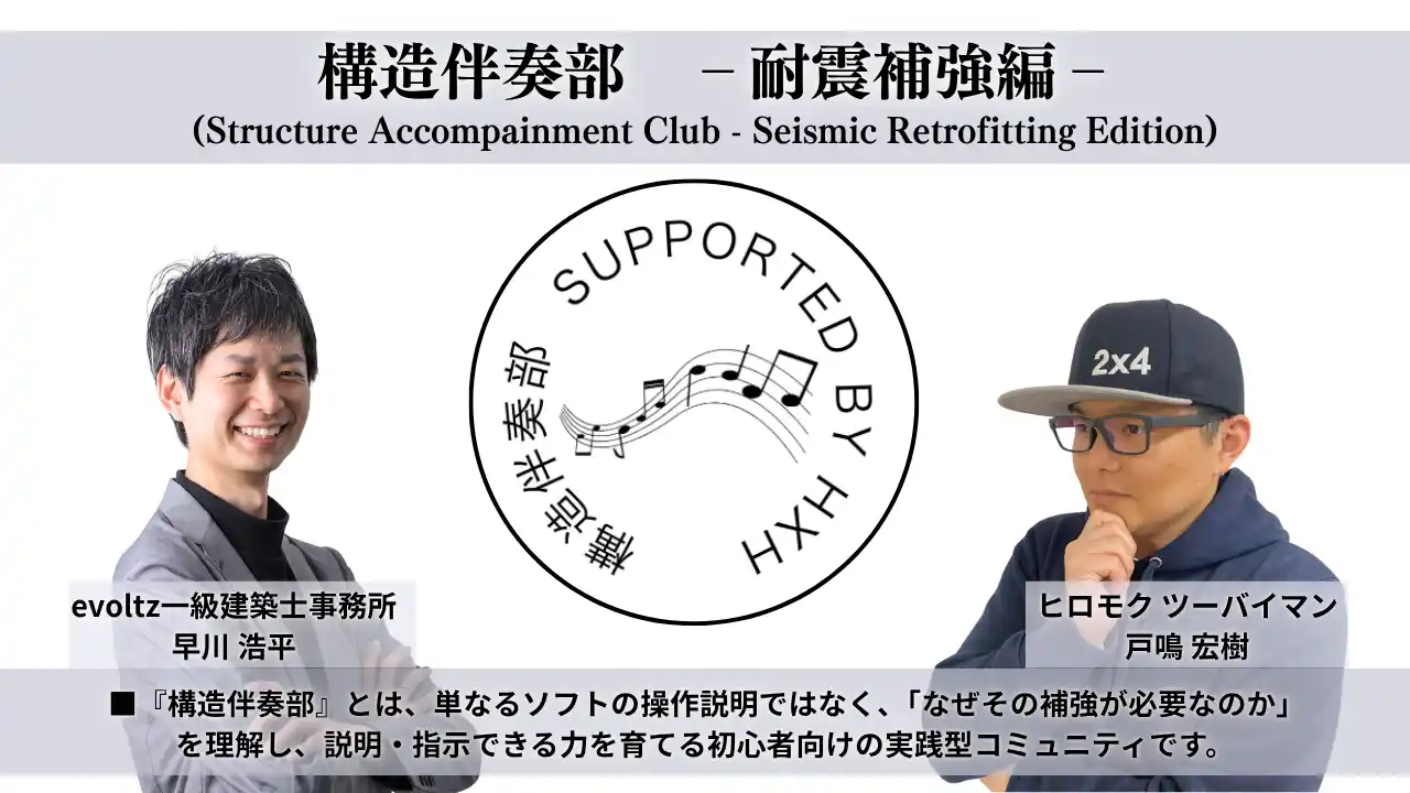 evoltz一級建築士事務所(管理建築士:早川浩平)と構造設計事務所のヒロモク(代表:戸鳴宏樹)は、耐震診断・補強設計の実務初心者や不安を抱える設計者を対象とした、初心者向け実践伴奏型オンラインコミュニティ『構造伴奏部 耐震補強編』を本格始動いたします。 |