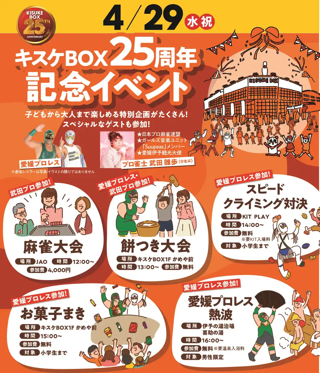 | キスケ株式会社は、1952年創業以来、“遊び”を通じて地域の日常に楽しさを届け続けてきました。2001年には、温泉・ボウリング・カラオケ・麻雀・ゲームセンター・飲食を一体化した四国最大級の複合エンターテイメント施設「キスケBOX」を開業。「ここに来れば、一日中楽しめる場所」を目指して進化を重ね、現在は年間約160万人が来場する地域の拠点として親しまれています。2026年に開業25周年を迎えます。 | |||