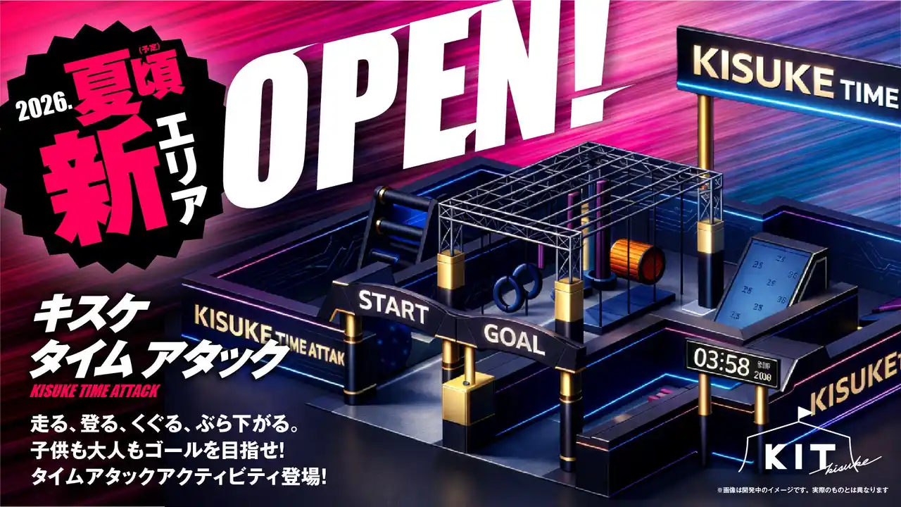 | キスケ株式会社が運営するキスケKITは、新エリア「KISUKE TIME ATTACK」を近日オープン予定です。本エリアは、近代五種の新種目として国際的に注目を集める障害物レース競技「Obstacle(オブスタクル)」に着想を得て開発を進める、体験型アトラクションです。世界で関心が高まる競技の魅力を、子どもから大人まで手軽に楽しめる形へと再構築し、キスケKITならではの新しい挑戦体験として展開します。 | |||