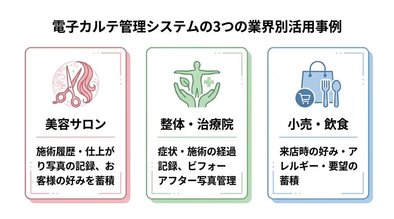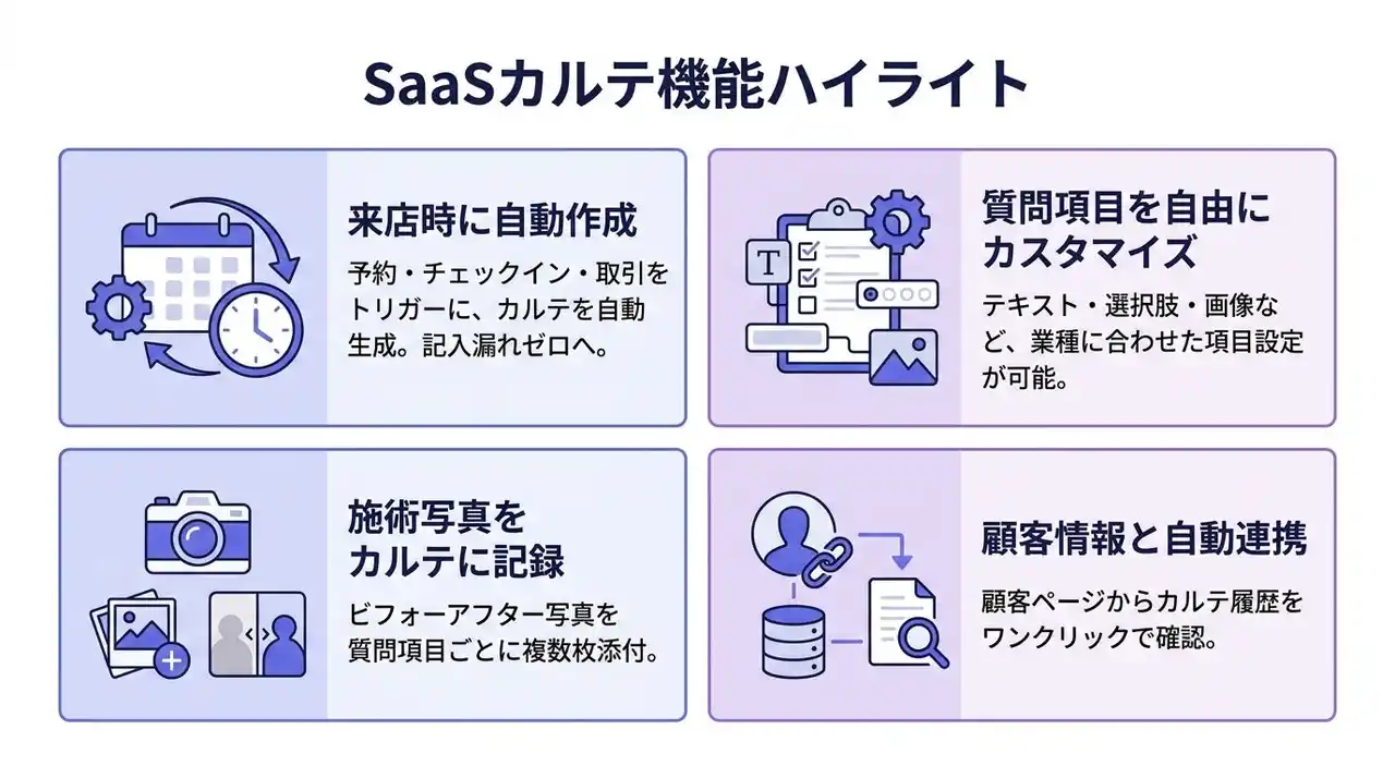 『カルテ管理』は、こうした課題を デジタルカルテの自動作成と一元管理 で解決し、店舗の接客品質向上と業務効率化を同時に実現します。 |