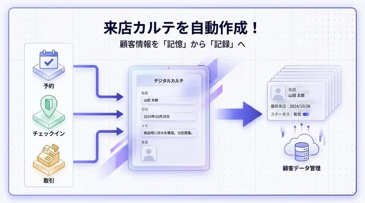 本機能は、来店時の予約・チェックイン・取引(会計)をトリガーとして 顧客カルテを自動作成 し、施術内容・接客メモ・写真などを一元管理できる機能です。美容サロン・整体院・小売・飲食店など、来店型ビジネスにおける顧客情報の属人化・紙カルテの煩雑さ を解消し、スタッフ全員が過去の対応履歴を共有できる環境を実現します。 |