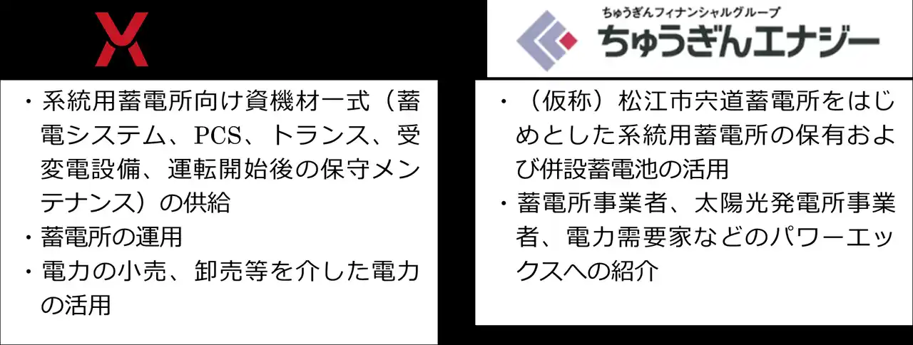 基本合意書によって4月より着工となる「(仮称)松江市宍道蓄電所」は、2026年度中に運転開始を予定しております。本件はちゅうぎんエナジーによる蓄電池事業における第1号案件であり、さらにパワーエックスにおいても地方銀行グループが所有する系統用蓄電所を運用する初めての案件であります。今後も共同で蓄電池活用による地産地消型エネルギー利用の拡大を推進し、再生可能エネルギー拡大に一層貢献してまいります。 |