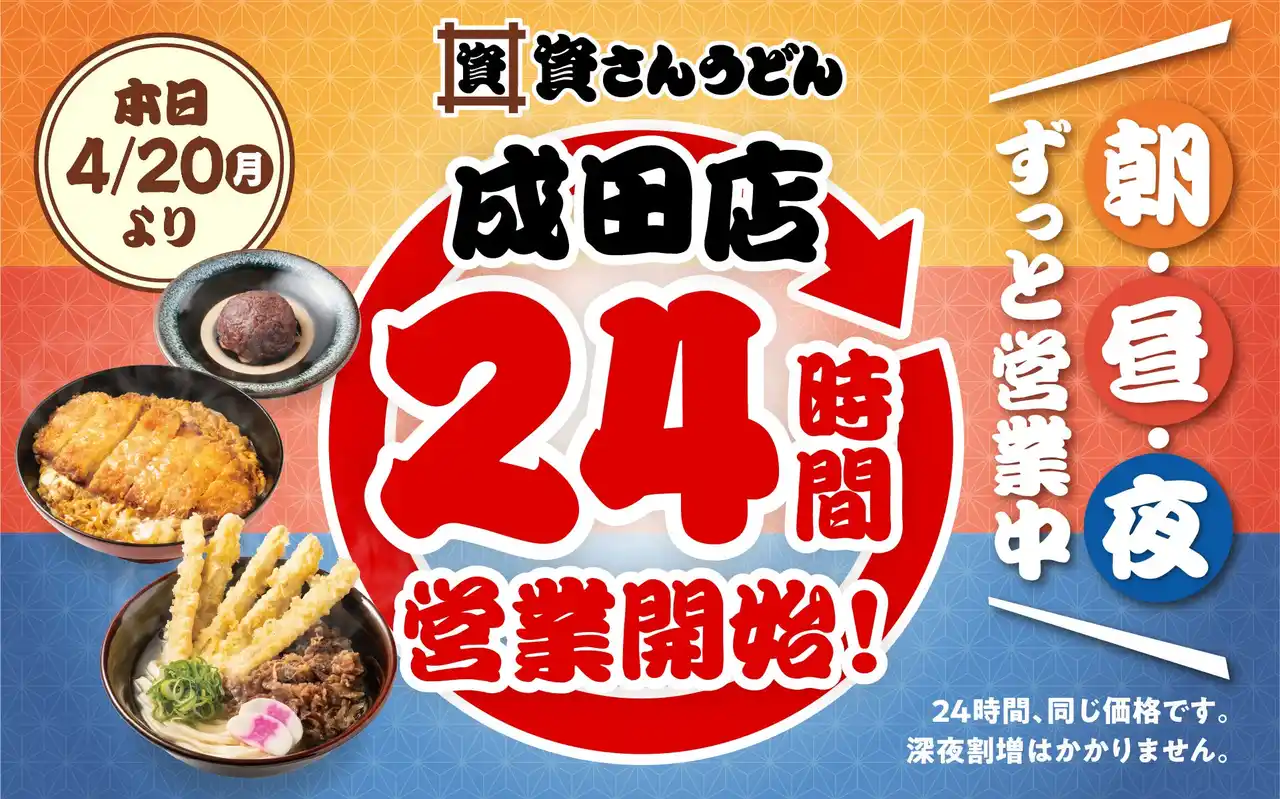 | 4/20(月)朝8時~、資さんうどん成田店は“24時間営業”を開始します。 |