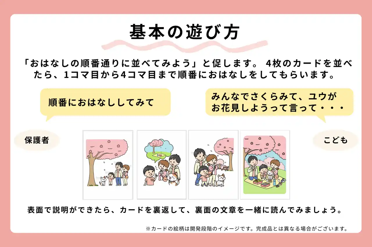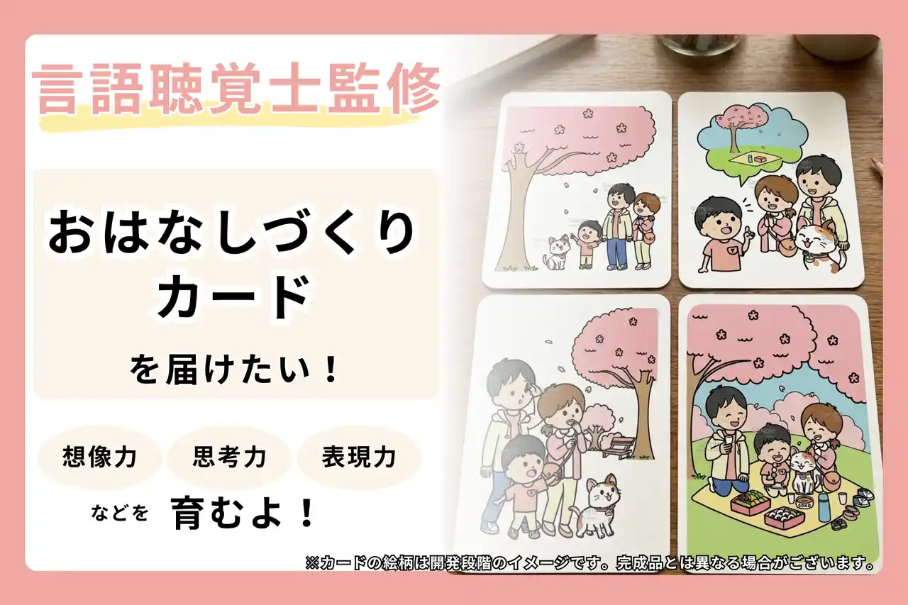 今回開発する「おはなしづくりカード」は現役の言語聴覚士が監修。日常生活に即した4コマ構成のカードで、語彙が少ないお子さんでも無理なく取り組めます。 |