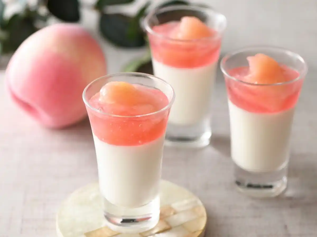 ぷるんと輝く白桃ジュレに、真っ白なパンナコッタ。 スプーンですくうたび、桃のみずみずしい香りがふわりと広がります。 甘すぎず、軽やかな口どけは、食後のデザートにもぴったり♪ |