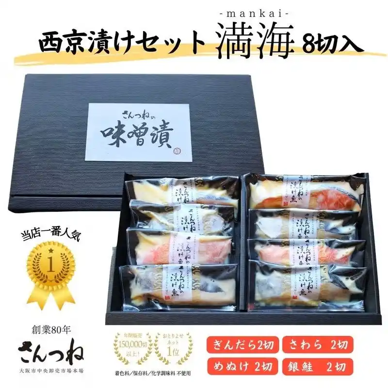 「上品な味付けが好み」とおっしゃるお母様には、西京漬けだけを4種8切れ詰め合わせたこちらのセット『満海』をぜひどうぞ。個包装・真空パックで、欲しい分だけ食べられることも人気のポイント。お一人暮らし、または少人数でお暮しのお母様へのギフトにピッタリです。 |