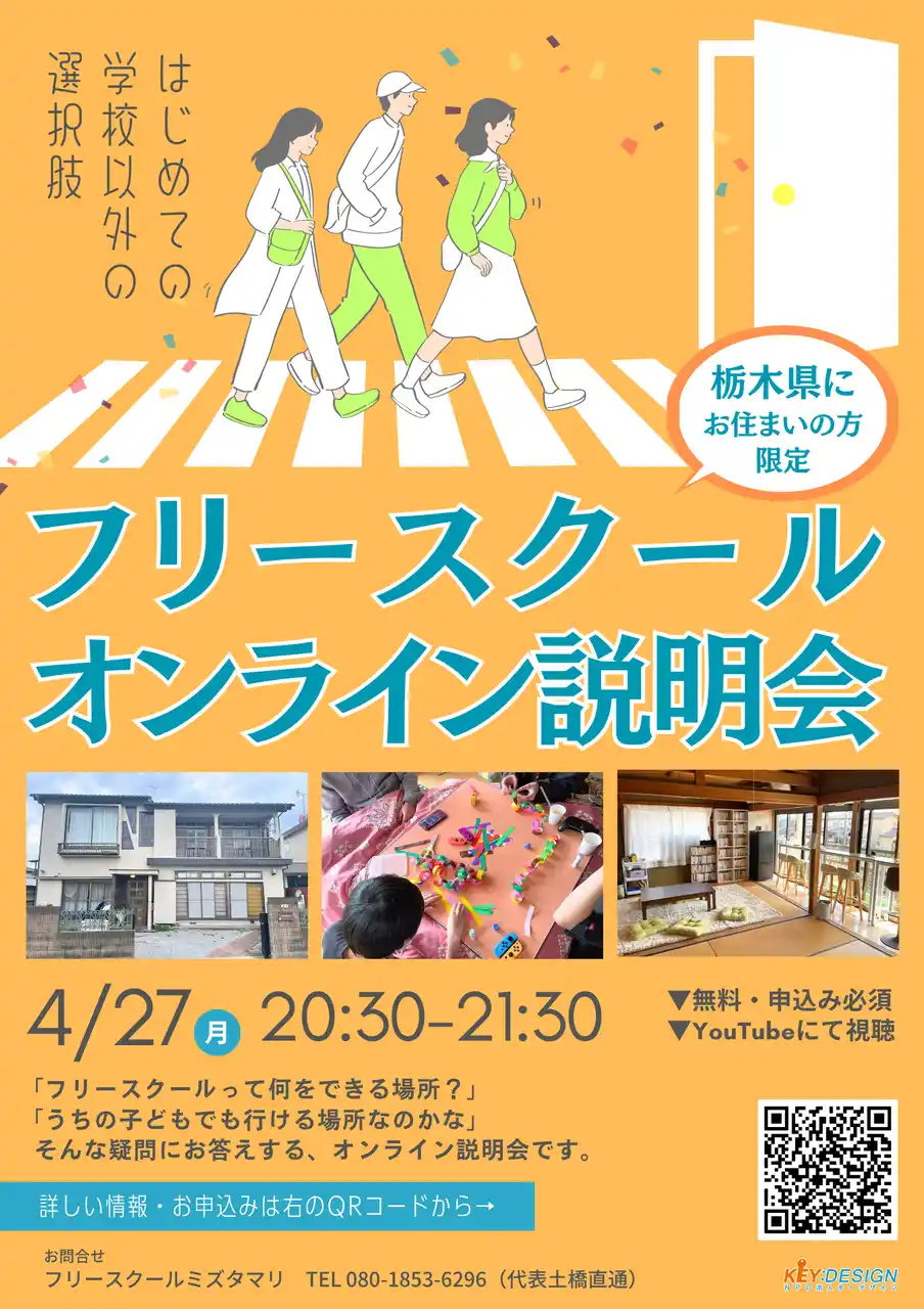 | NPO法人キーデザイン(栃木県宇都宮市、代表理事:土橋優平)は、不登校や行き渋りの子どもを持つ保護者を対象に、「フリースクールオンライン説明会」を2026年4月27日(月)20:30~21:30にYouTubeライブ配信にて開催いたします。 | |||||||||