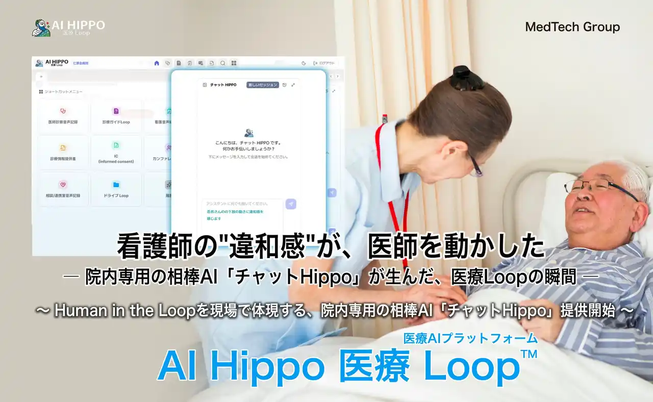 | 医療AIと病院AI PMOカンパニー、MedTech Group株式会社(本社:東京都港区、代表取締役社長 前田清貴、以下MedTech G社)と企業データとAIの利活用カンパニー、AIデータ株式会社(本社:東京都港区、代表取締役社長 佐々木隆仁、以下AIデータ社)は、医療現場における意思決定支援を目的としたAIプラットフォーム「AI Hippo 医療Loop」において、院内専用の相棒AI「チャットHippo」の提供を開始しました。 | |||