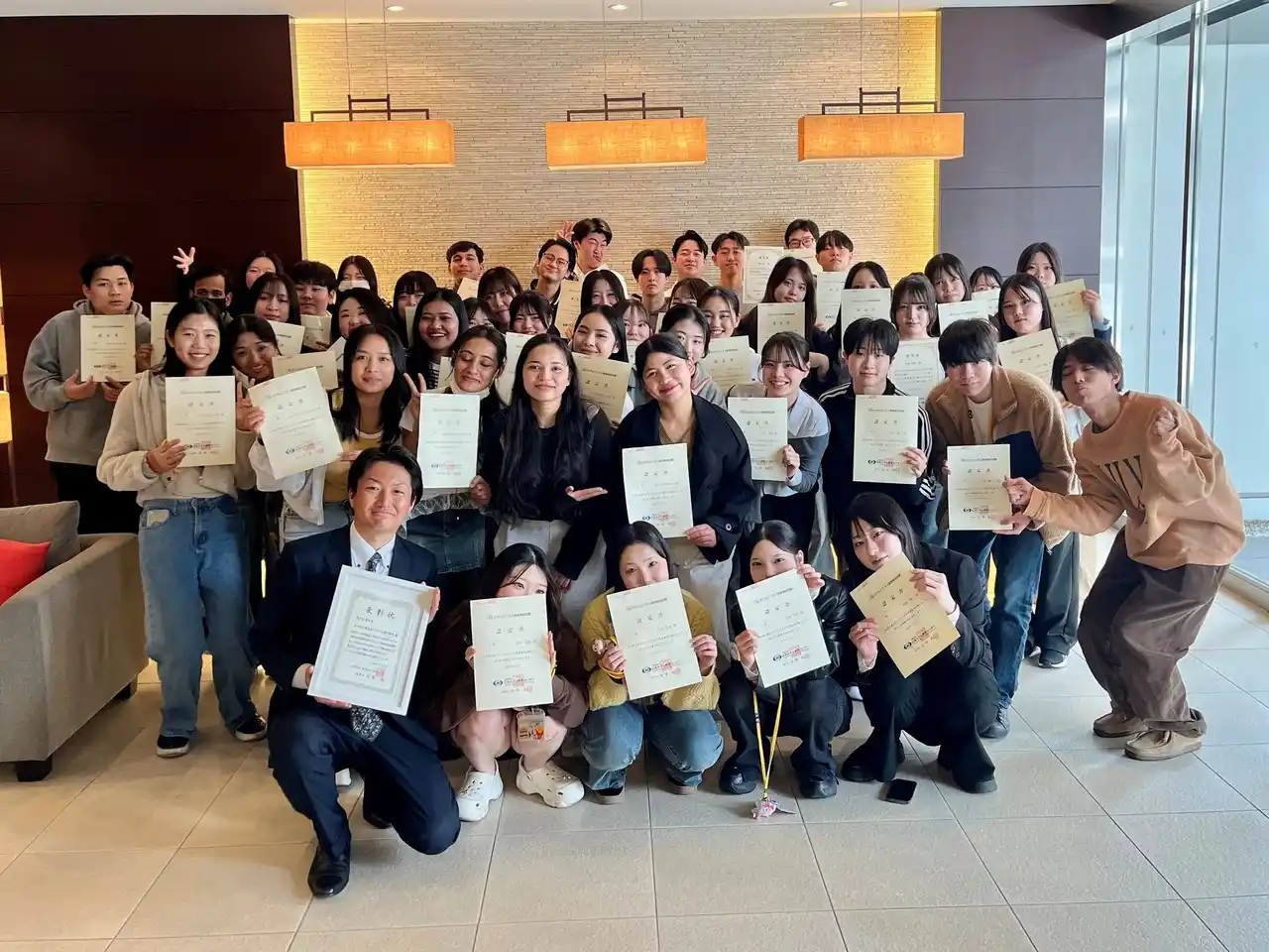| 福岡 麻生外語観光&ブライダル専門学校は、ホテル・リゾート科1年生が受験した「ホテルビジネス実務検定」において、優秀な成績が評価され、検定協会より「優秀指導校賞」を受賞しました。本賞は、優れた検定結果を収めた教育機関に贈られるもので、本校の教育成果が高く評価されたものです。2025年度の検定では合格率100%(2級)、93.3%(1級)と、過去最高の実績を達成しました。 | ||||||||