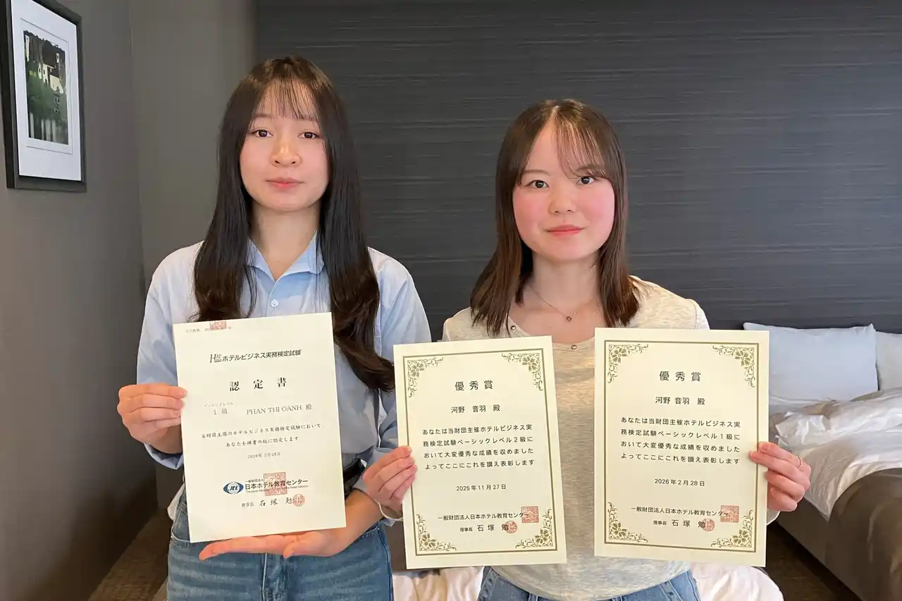 福岡 麻生外語観光&ブライダル専門学校は、ホテル・リゾート科1年生が受験した「ホテルビジネス実務検定」において、優秀な成績が評価され、検定協会より「優秀指導校賞」を受賞しました。