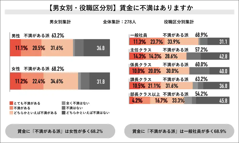 【男女別・役職別】 賃金に不満がある派の男女別では、男性が63.2%、女性が68.2%と、女性の方が不満を抱いている結果となりました。また、賃金に不満がある派の役職別では、一般社員が68.9%、課長クラスが63.2%、係長クラスが60.0%、主任クラスが57.2%、部長クラス以上が54.2%となりました。 |