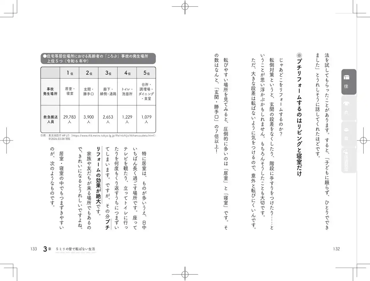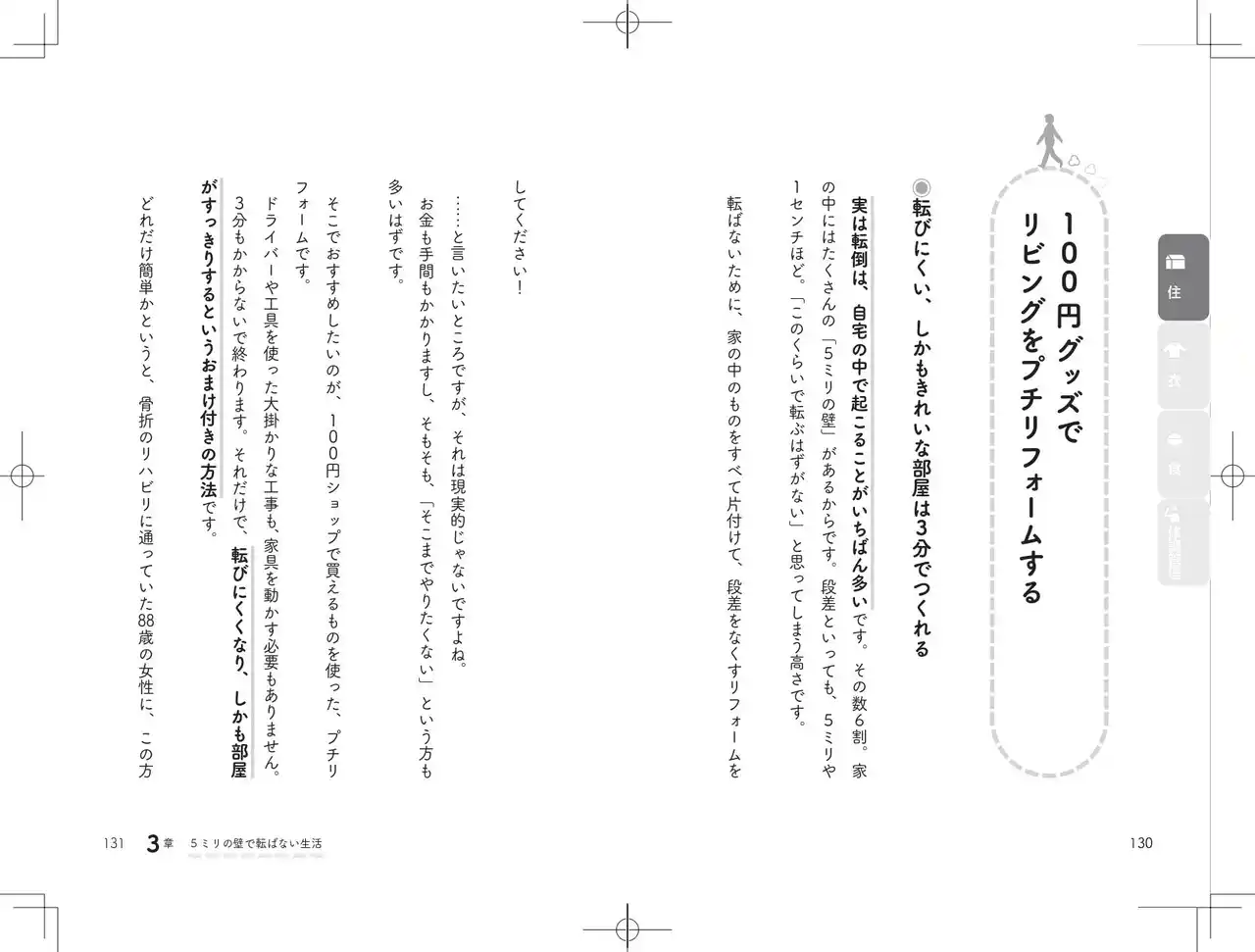 実は、高齢者の転倒の約8割は、わずか5ミリほどの段差につまずくことで発生していると言われています。著者は、この見過ごされがちな段差を「5ミリの壁」と呼んでいます。 |