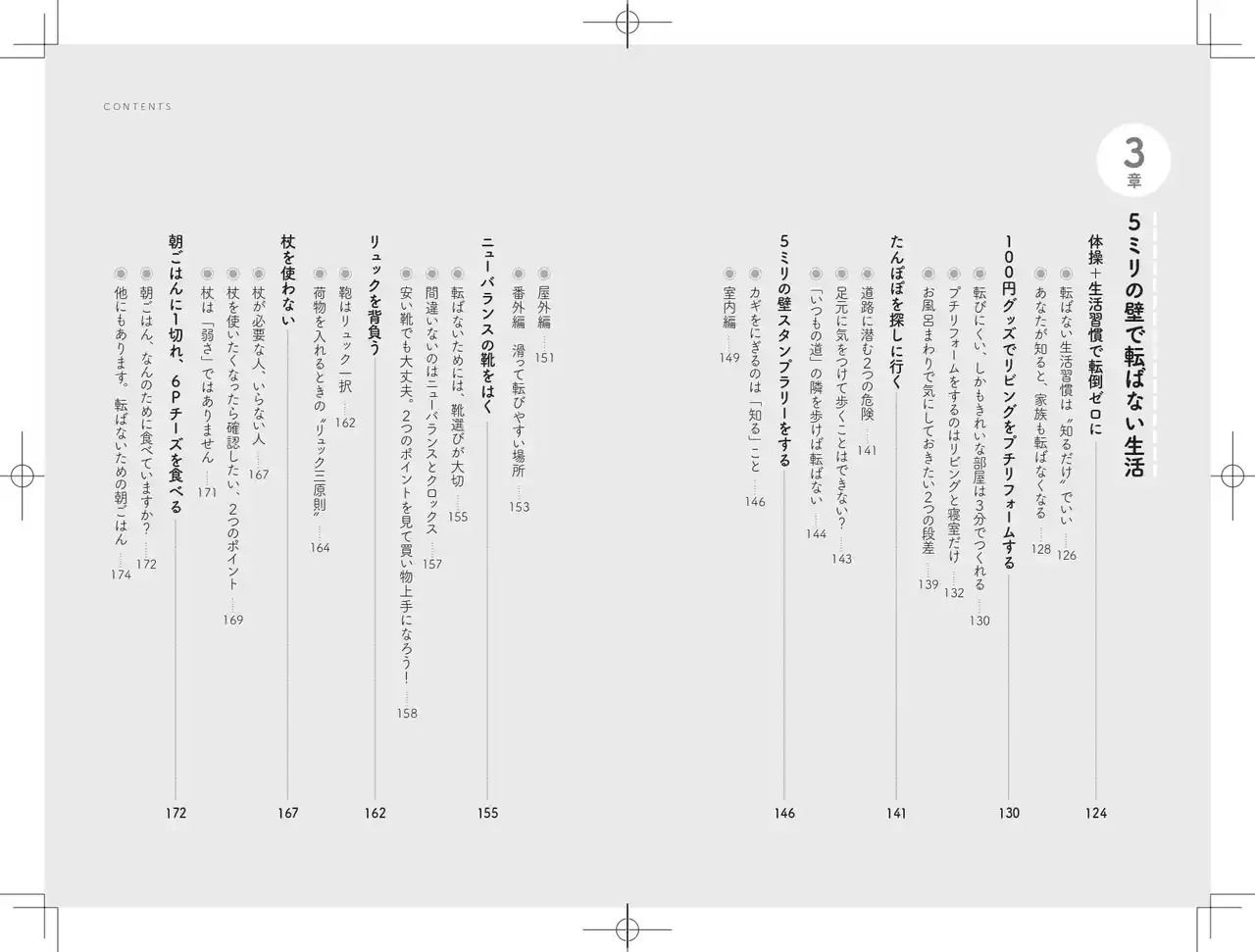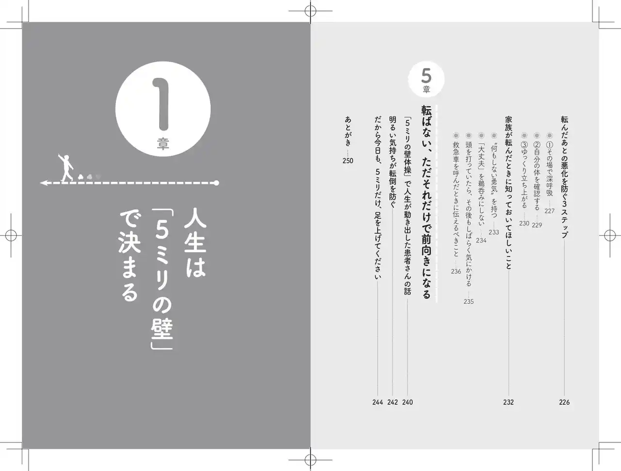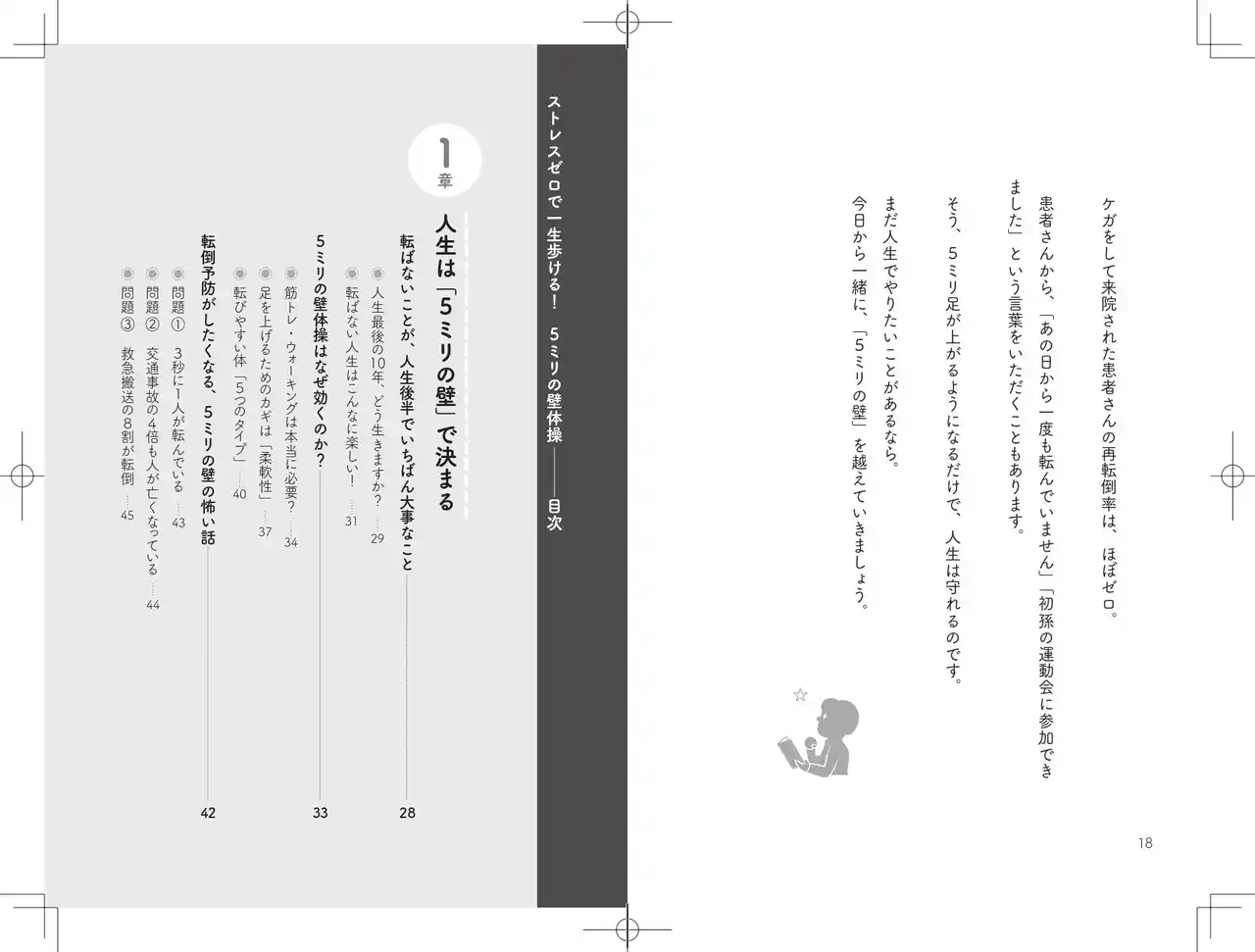 本書では、筋トレやウォーキングだけでは対応しきれない転倒リスクに対し、「わずか5ミリの段差でつまずかない身体」をつくるための具体的な方法を紹介しています。 |