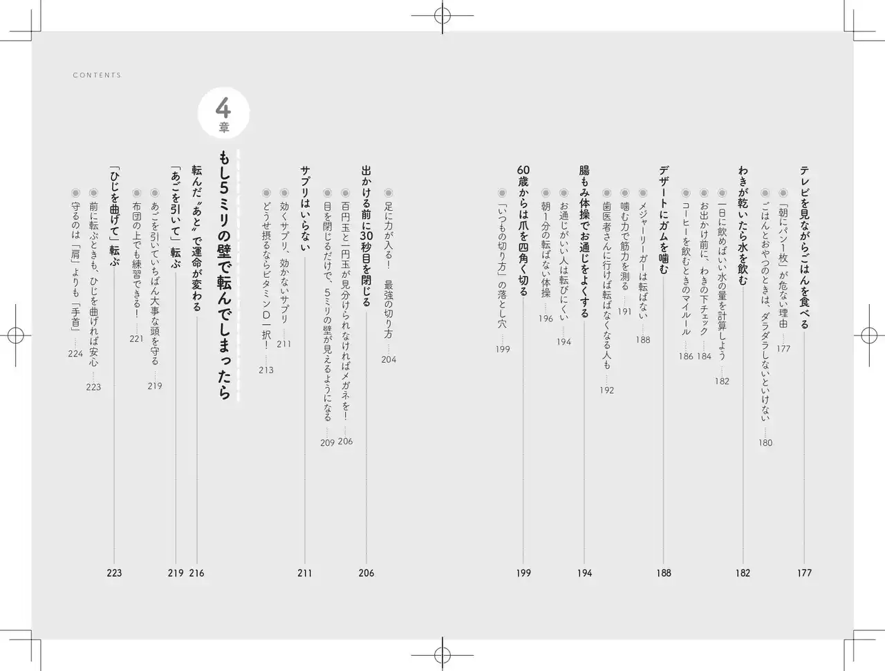 現場で多くの人と向き合う中で、繰り返し耳にしたのは、「まさか、この段差でつまずくとは思わなかった」という言葉でした。 また、寝たきりになる原因のうち、自分で予防できるものとして最も多いのが「転倒」であることから、著者は「人生後半で最も重要なのは、転ばないこと」だと考えています。 |