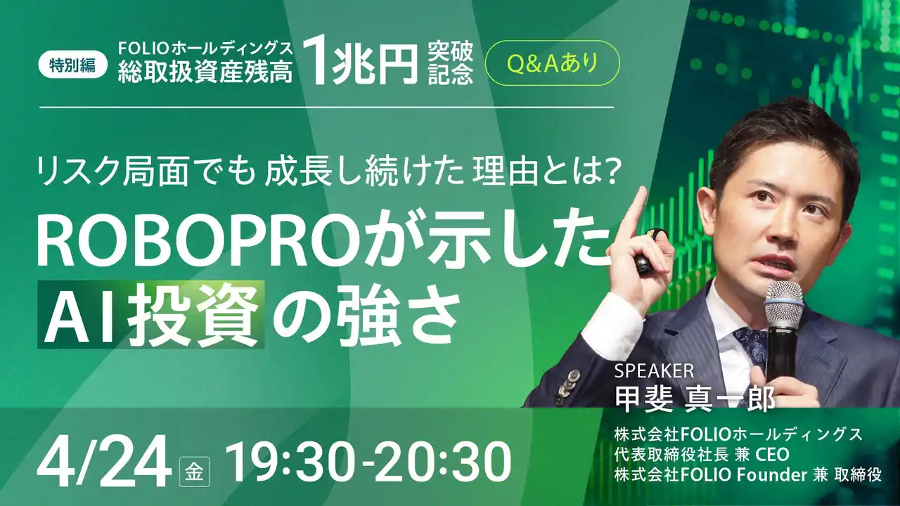 SBIグループで革新的な金融ソリューションを提供する株式会社FOLIOホールディングスの子会社である株式会社FOLIO(本社:東京都千代田区、代表取締役:四元 盛文、以下「FOLIO」 )は、FOLIOホールディングスの総取扱資産残高*1兆円突破を記念し、「リスク局面でも成長し続けた理由とは?ROBOPROが示したAI投資の強さ」と題した特別セミナーを開催します。 |