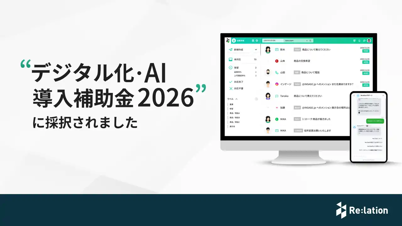 | 株式会社インゲージ(本社:大阪府大阪市、代表取締役社長:和田 哲也、以下インゲージ)は、この度当社が提供するコミュニケーションプラットフォーム『Re:lation(リレーション)』が「デジタル化・AI導入補助金2026」の補助金対象ITツールとして登録されたことをお知らせいたします。 | |||