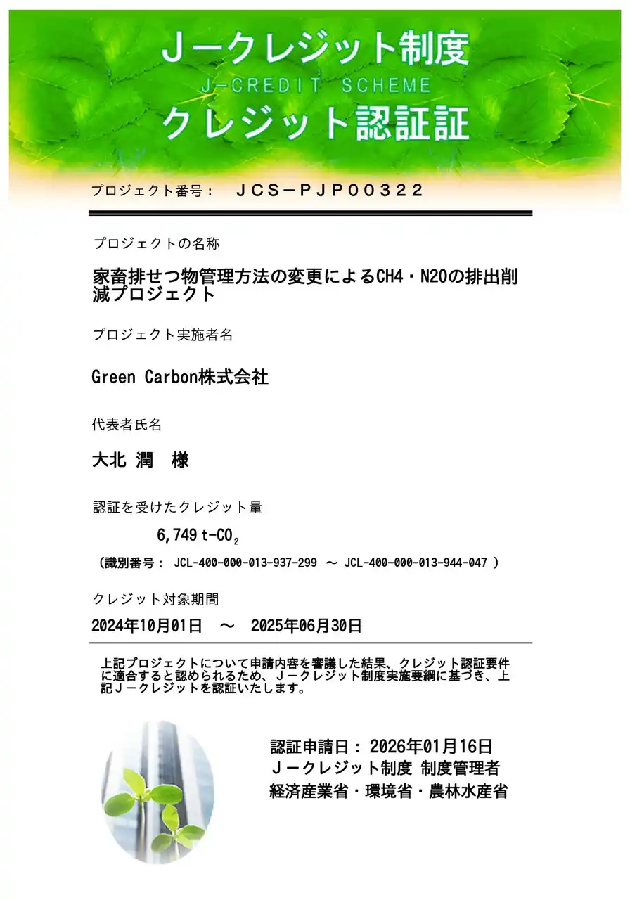 国内最大規模のネイチャーベースのカーボンクレジット創出・販売事業を展開するGreen Carbon株式会社(代表取締役:大北潤、以下「Green Carbon」)は、北海道を中心とする酪農家と連携し、※1家畜排せつ物管理方法の変更(J-クレジット AG-002方法論)に基づくクレジット創出プロジェクト(以下、本プロジェクト)において、国内最大規模となる6,749t-CO2のJ-クレジットを創出したことをお知らせします。 |